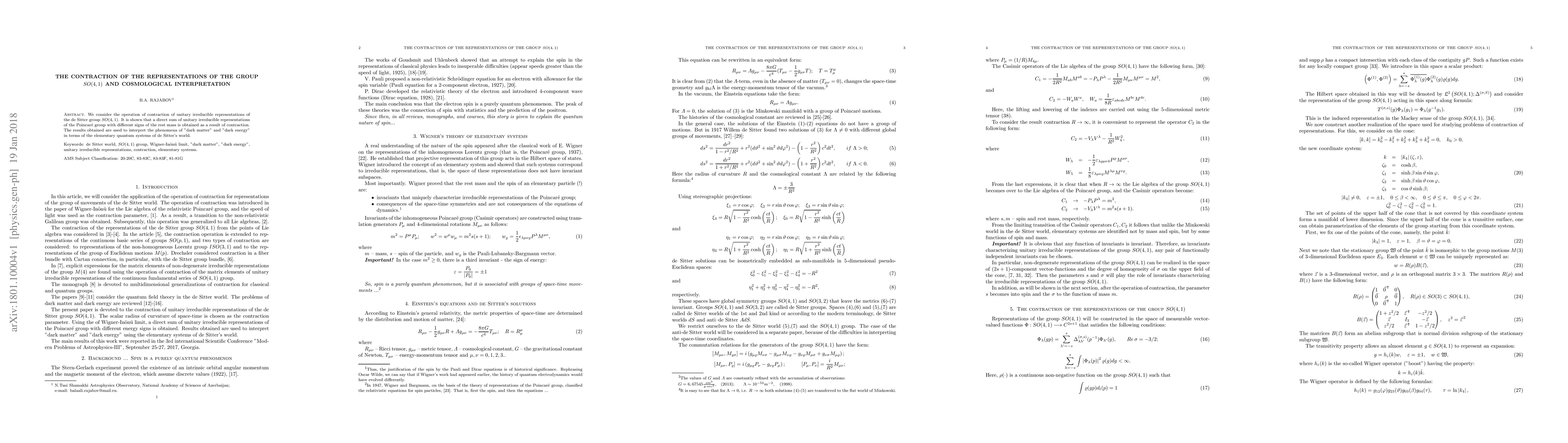 This paper explores the contraction of unitary irreducible representations of the de Sitter group $SO(4,1)$ to obtain the Poincaré group, revealing distinct rest mass signs. The findings are applied to interpret "dark matter" and "dark energy" in the context of elementary quantum systems in de Sitter's cosmology.