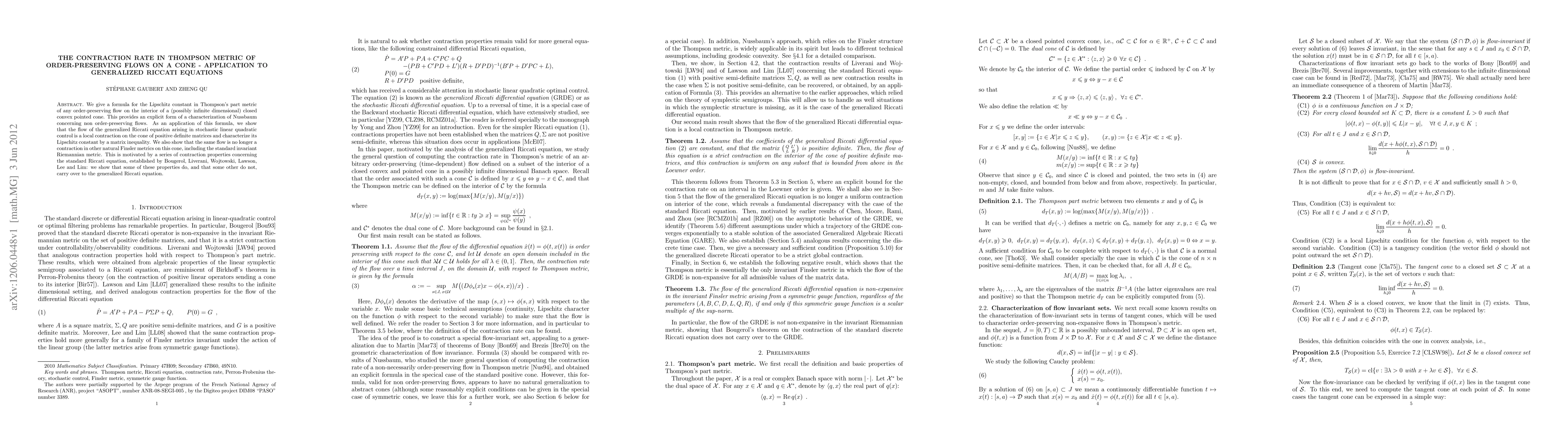 This paper provides a formula for the Lipschitz constant in Thompson's metric for order-preserving flows on a closed convex cone, applying it to show that the generalized Riccati equation's flow contracts on the cone of positive definite matrices. It also demonstrates that this flow does not contract under other Finsler metrics, including the Riemannian metric.