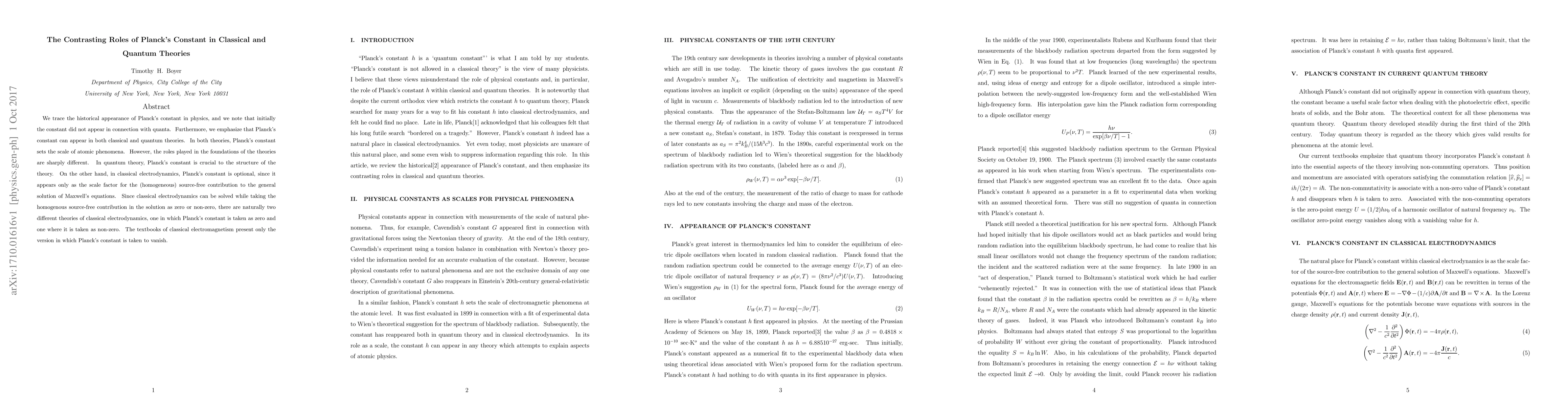 We trace the historical appearance of Planck's constant in physics, and we note that initially the constant did not appear in connection with quanta. Furthermore, we emphasize that Planck's constant can appear in both classical and quantum theories. In both theories, Planck's constant sets the scale of atomic phenomena. However, the roles played in the foundations of the theories are sharply different. In quantum theory, Planck's constant is crucial to the structure of the theory. On the other hand, in classical electrodynamics, Planck's constant is optional, since it appears only as the scale factor for the (homogeneous) source-free contribution to the general solution of Maxwell's equations. Since classical electrodynamics can be solved while taking the homogenous source-free contribution in the solution as zero or non-zero, there are naturally two different theories of classical electrodynamics, one in which Planck's constant is taken as zero and one where it is taken as non-zero. The textbooks of classical electromagnetism present only the version in which Planck's constant is taken to vanish.