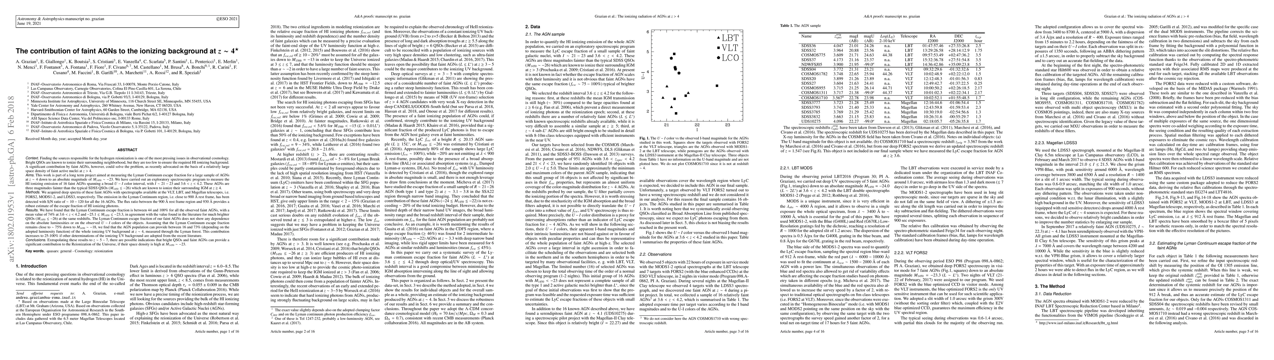 Faint active galactic nuclei (AGNs) contribute significantly to the ionizing background at z~4, with a mean LyC escape fraction of 74%, providing 16-73% of the ionizing UV background.