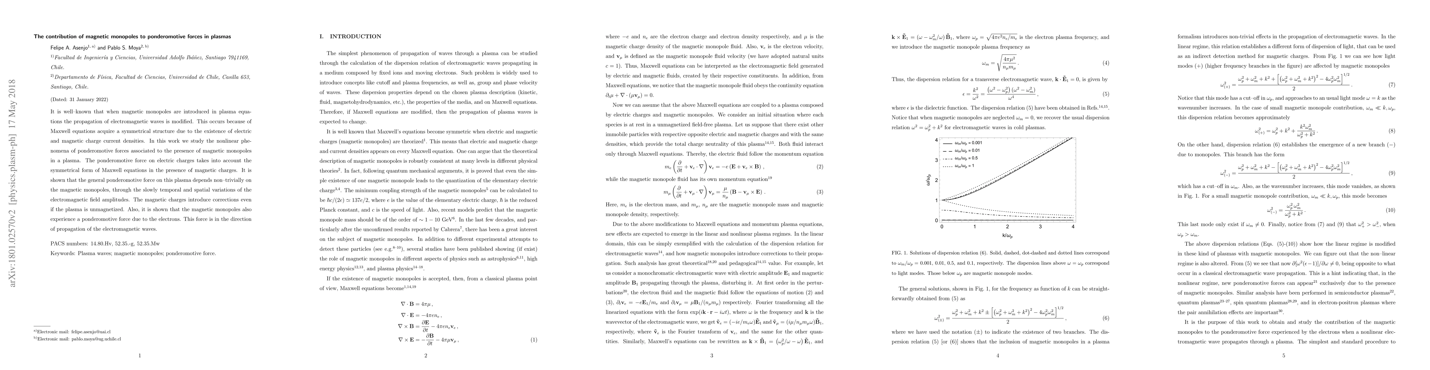 This paper explores the influence of magnetic monopoles on ponderomotive forces in plasmas, showing that their presence modifies the propagation of electromagnetic waves and induces magnetization, leading to a cyclotron frequency proportional to the magnetic charge. The study also reveals that magnetic monopoles experience a ponderomotive force due to electrons, affecting their motion along the wave's direction.