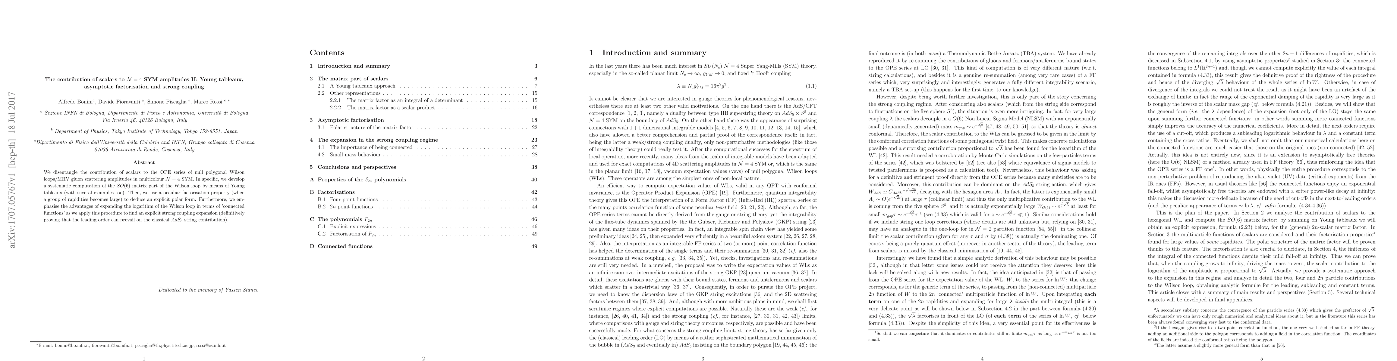 We disentangle the contribution of scalars to the OPE series of null polygonal Wilson loops/MHV gluon scattering amplitudes in multicolour ${\cal N}=4$ SYM. In specific, we develop a systematic computation of the $SO(6)$ matrix part of the Wilson loop by means of Young tableaux (with several examples too). Then, we use a peculiar factorisation property (when a group of rapidities becomes large) to deduce an explicit polar form. Furthermore, we emphasise the advantages of expanding the logarithm of the Wilson loop in terms of 'connected functions' as we apply this procedure to find an explicit strong coupling expansion (definitively proving that the leading order can prevail on the classical $AdS_5$ string contribution).