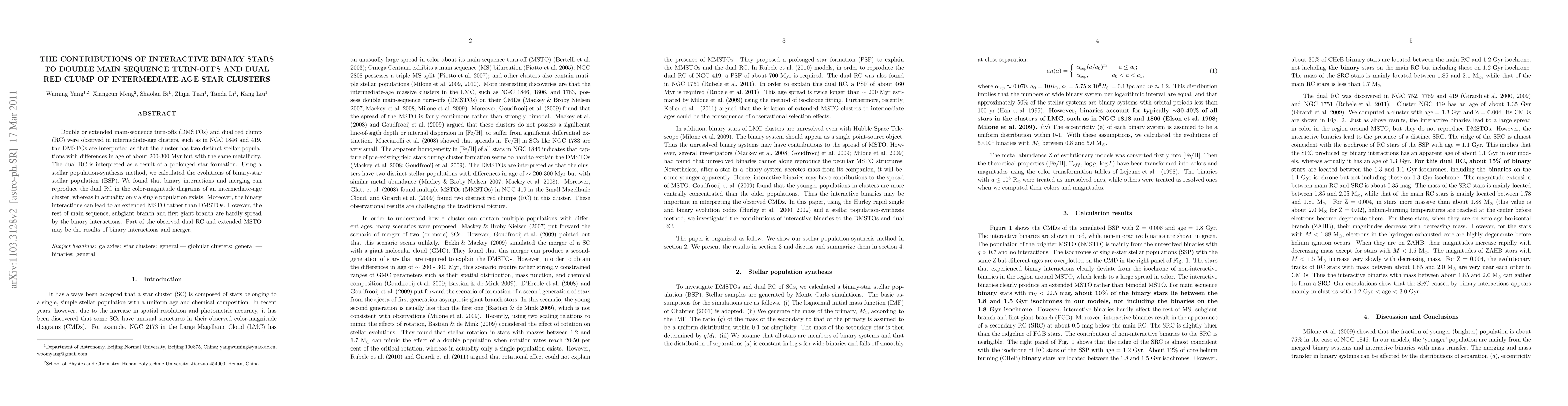 This paper investigates the impact of interactive binary stars on the double main-sequence turn-offs and dual red clump observed in intermediate-age star clusters. The findings suggest binary interactions and mergers can reproduce these features, indicating they may partially explain the observed phenomena.