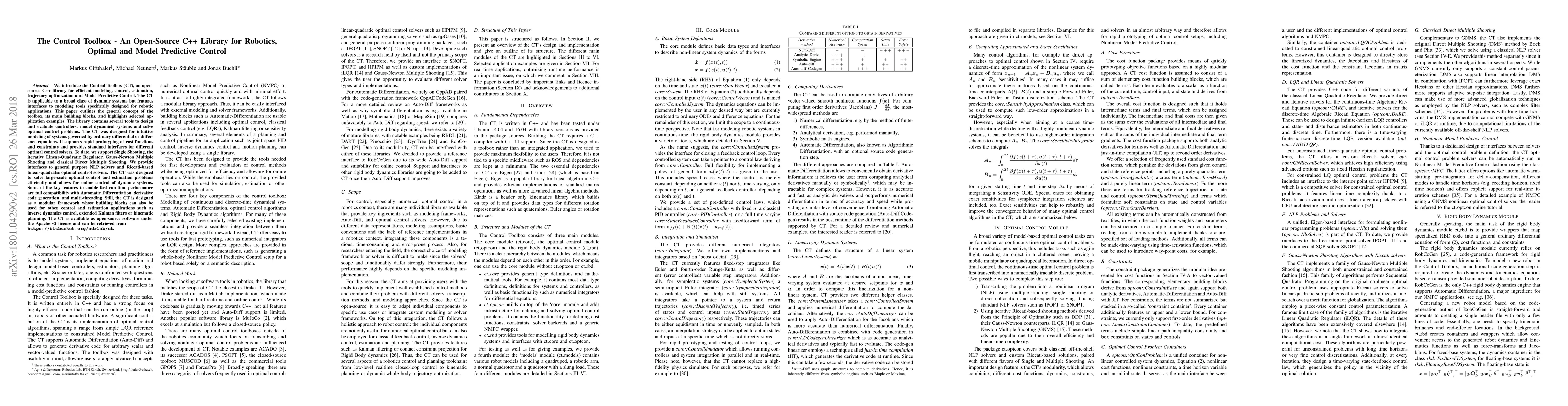 The Control Toolbox (CT) is an open-source C++ library for robotics and optimal control, featuring tools for modeling, estimation, and solving optimal control problems, with interfaces for various solvers and support for multi-threading and automatic differentiation. It is designed for efficient large-scale optimal control and estimation, with modular components applicable to diverse control applications.