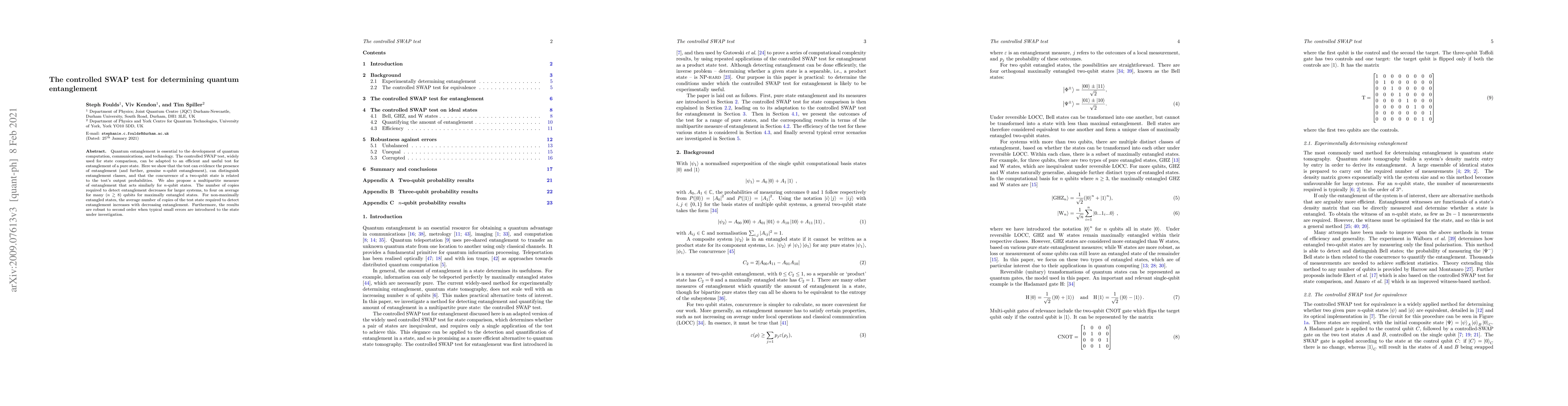 The controlled SWAP test is adapted for efficiently determining quantum entanglement, revealing its presence and distinguishing between entanglement classes, with concurrence related to output probabilities. The test requires fewer copies for larger systems, and results are robust against small errors.