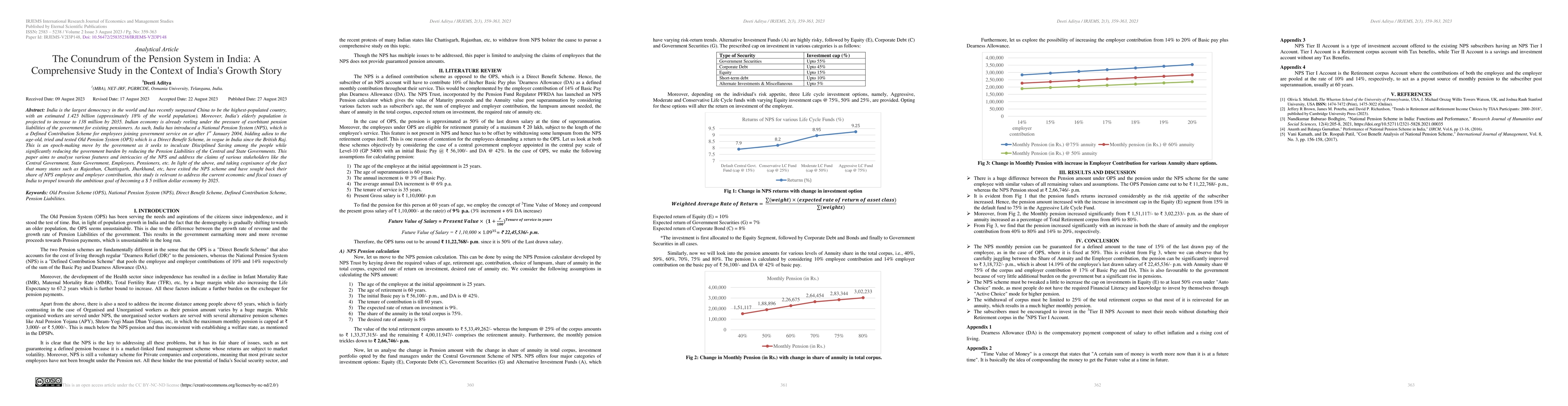 India is the largest democracy in the world and has recently surpassed China to be the highest-populated country, with an estimated 1.425 billion (approximately 18% of the world population). Moreover, India's elderly population is projected to increase to 138 million by 2035. Indian economy is already reeling under the pressure of exorbitant pension liabilities of the government for existing pensioners. As such, India has introduced a National Pension System (NPS), which is a Defined Contribution Scheme for employees joining government service on or after 1st January 2004, bidding adieu to the age-old, tried and tested Old Pension System (OPS) which is a Direct Benefit Scheme, in vogue in India since the British Raj. This is an epoch-making move by the government as it seeks to inculcate Disciplined Saving among the people while significantly reducing the government burden by reducing the Pension Liabilities of the Central and State Governments. This paper aims to analyse various features and intricacies of the NPS and address the claims of various stakeholders like the Central Government, State Government, Employees, Pensioners, etc. In light of the above, and taking cognisance of the fact that many states such as Rajasthan, Chattisgarh, Jharkhand, etc, have exited the NPS scheme and have sought back their share of NPS employee and employer contribution, this study is relevant to address the current economic and fiscal issues of India to propel towards the ambitious goal of becoming a $ 5 trillion dollar economy by 2025. Keywords: Old Pension Scheme (OPS), National Pension System (NPS), Direct Benefit Scheme, Defined Contribution Scheme, Pension Liabilities.