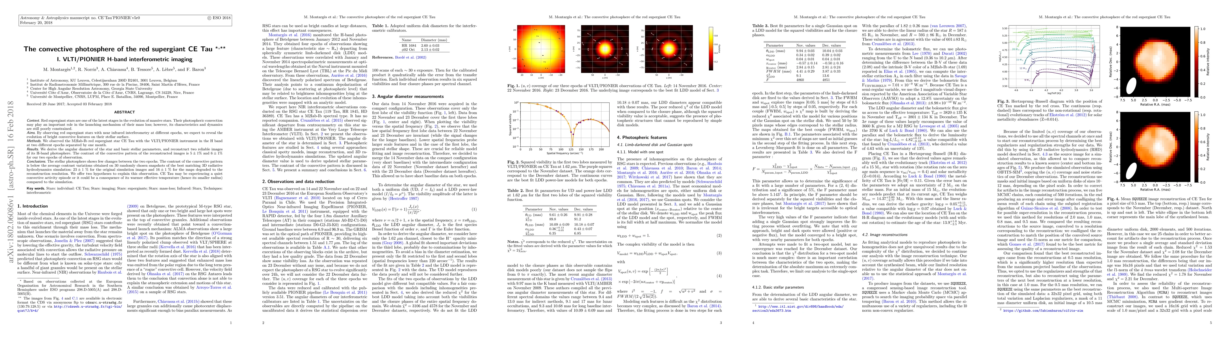 This study uses VLTI/PIONIER H-band interferometry to observe the red supergiant CE Tau, revealing stable convective patterns with a contrast of 5-6% over one month. The findings suggest CE Tau's photosphere exhibits minimal changes, potentially indicating a quiet convective phase or a warmer effective temperature compared to simulations.