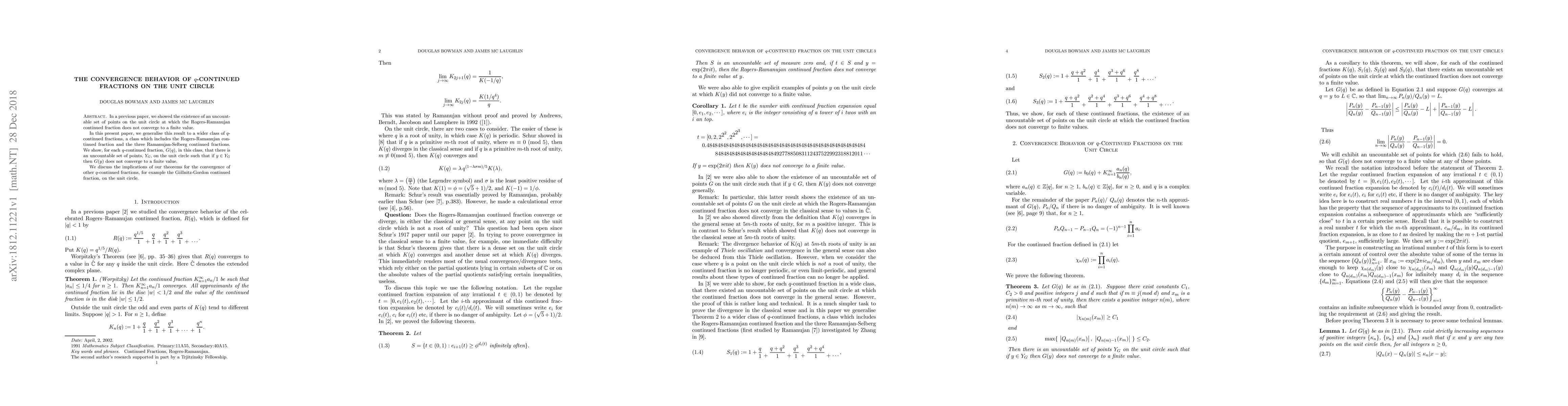 This paper shows that a class of q-continued fractions on the unit circle has an uncountable set of points where the fractions do not converge to finite values. The result generalizes previous findings on the Rogers-Ramanujan continued fraction.