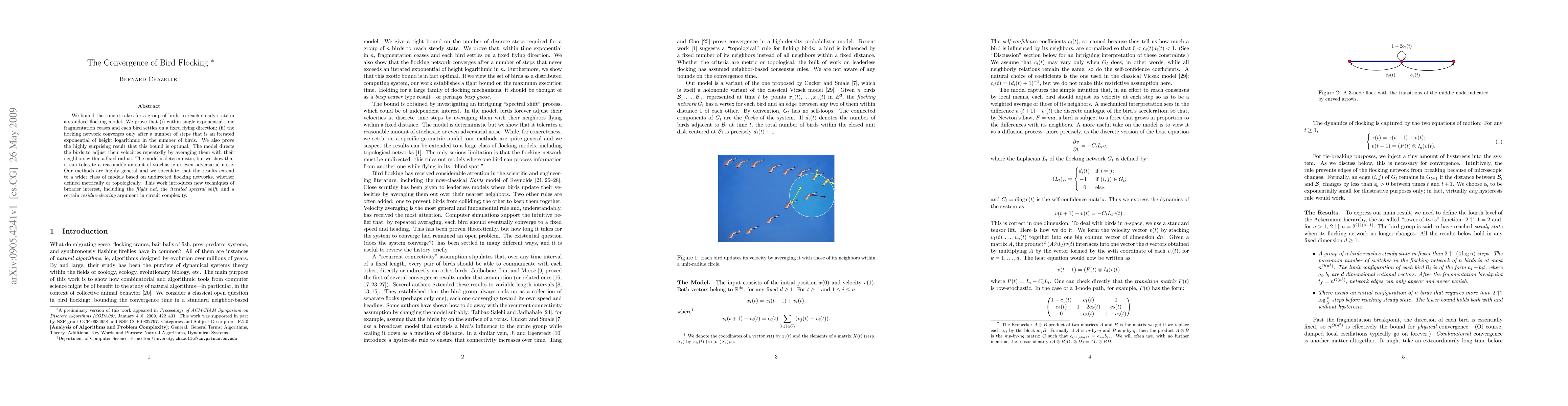 We bound the time it takes for a group of birds to reach steady state in a standard flocking model. We prove that (i) within single exponential time fragmentation ceases and each bird settles on a fixed flying direction; (ii) the flocking network converges only after a number of steps that is an iterated exponential of height logarithmic in the number of birds. We also prove the highly surprising result that this bound is optimal. The model directs the birds to adjust their velocities repeatedly by averaging them with their neighbors within a fixed radius. The model is deterministic, but we show that it can tolerate a reasonable amount of stochastic or even adversarial noise. Our methods are highly general and we speculate that the results extend to a wider class of models based on undirected flocking networks, whether defined metrically or topologically. This work introduces new techniques of broader interest, including the "flight net," the "iterated spectral shift," and a certain "residue-clearing" argument in circuit complexity.