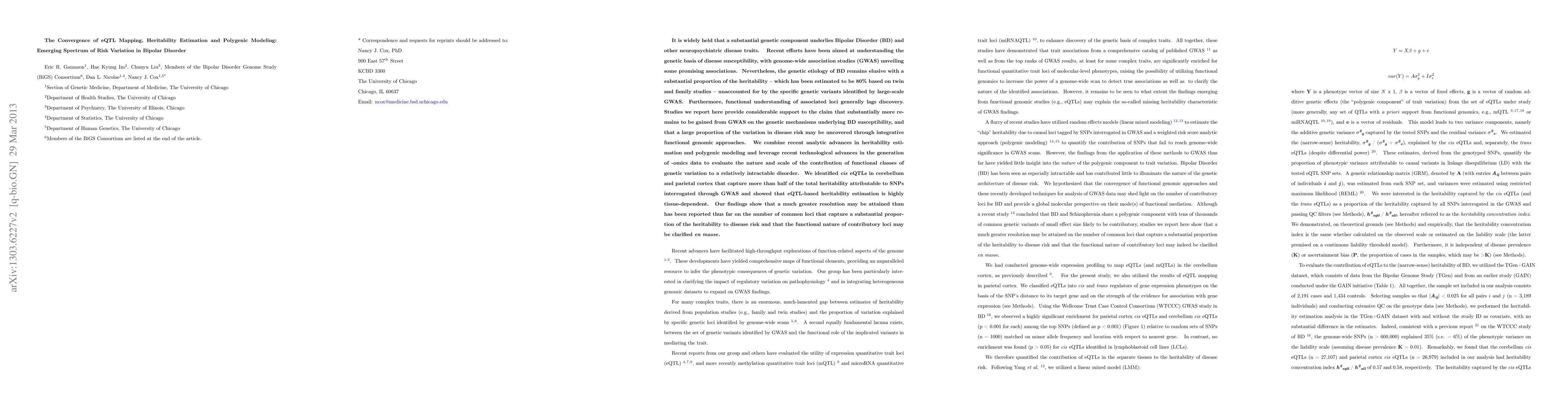 This paper explores the genetic basis of Bipolar Disorder (BD) through integrative functional genomics, combining eQTL mapping, heritability estimation, and polygenic modeling. It reveals that cis eQTLs in specific brain regions capture more than half of the heritability attributed to BD, suggesting a substantial proportion of disease risk variation remains to be uncovered through advanced genomic approaches.
