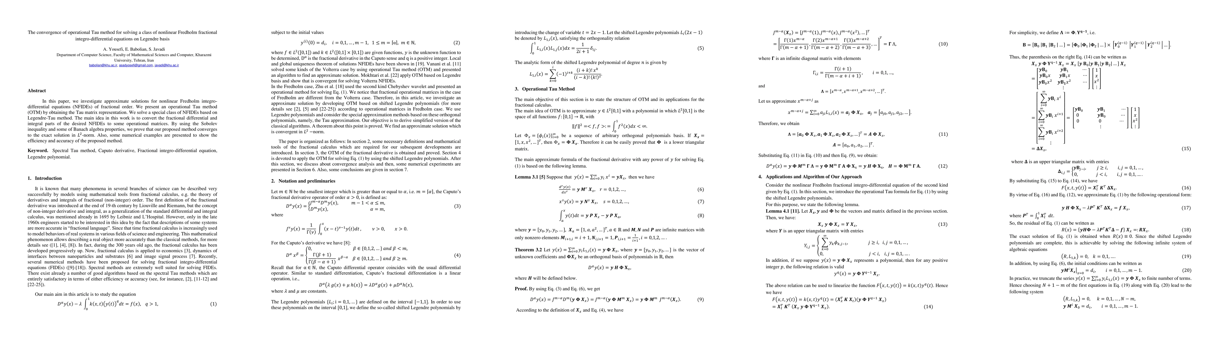 This paper proposes an operational Tau method for solving nonlinear Fredholm fractional integro-differential equations using the Legendre basis. The method's convergence to the exact solution is proven using the Sobolev inequality and Banach algebra properties.