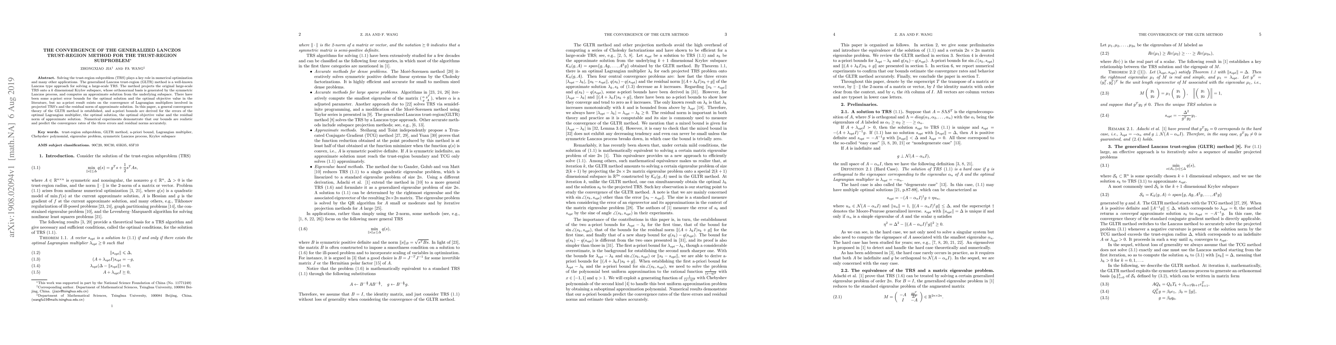 This paper establishes a convergence theory for the generalized Lanczos trust-region method (GLTR) for solving the trust-region subproblem (TRS) and derives a-priori bounds for errors in the optimal Lagrangian multiplier, solution, objective value, and residual norm. Numerical experiments validate the realism and accuracy of the proposed bounds.