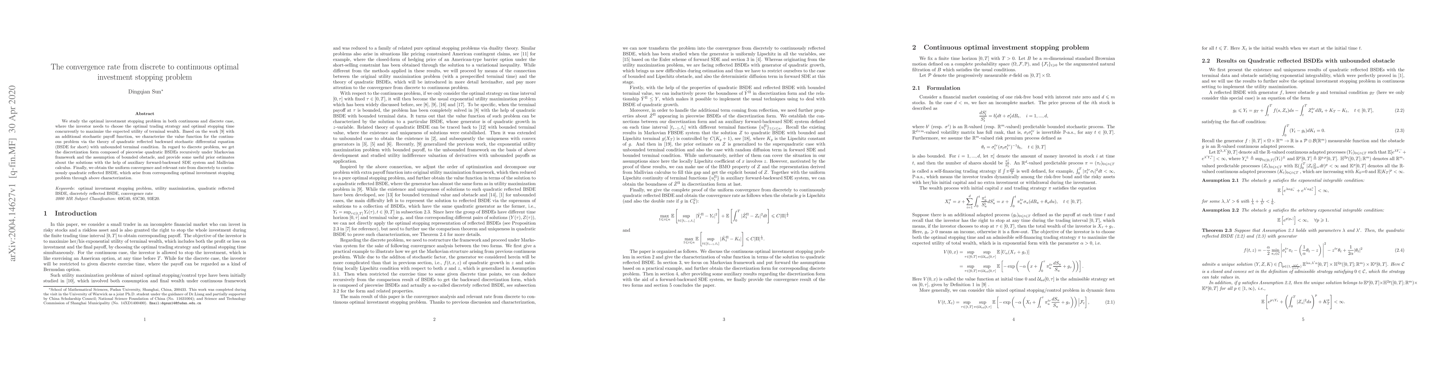 This paper investigates the convergence rate between discrete and continuous optimal investment stopping problems, characterizing the value function for the continuous case using quadratic reflected backward stochastic differential equations and providing a discretization form for the discrete case. It establishes uniform convergence and convergence rates between the two forms.
