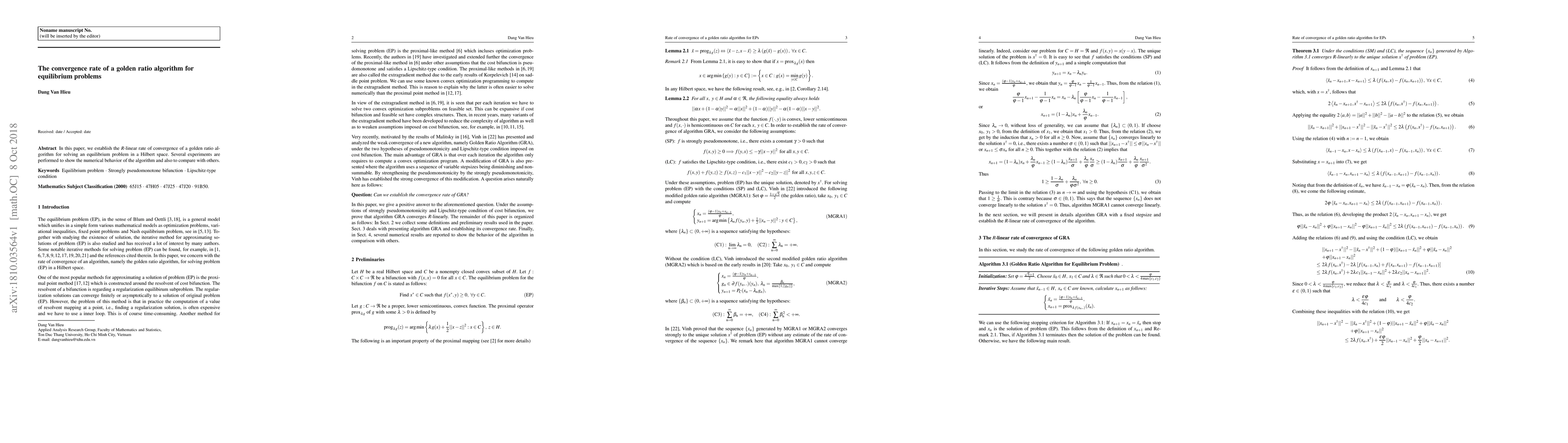 In this paper, we establish the $R$-linear rate of convergence of a golden ratio algorithm for solving an equilibrium problem in a Hilbert space. Several experiments are performed to show the numerical behavior of the algorithm and also to compare with others.