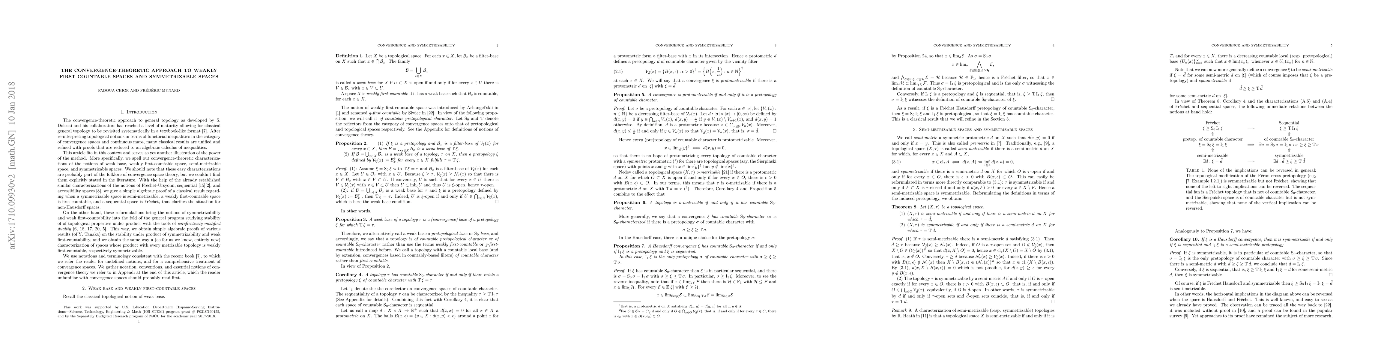 This paper explores convergence-theoretic characterizations of weak base, weakly first-countable, semi-metrizable, and symmetrizable spaces, providing algebraic proofs for classical results and stability properties under product. It clarifies conditions for non-Hausdorff spaces and introduces new characterizations for spaces whose product with metrizable spaces retains weak first-countability or symmetrizability.