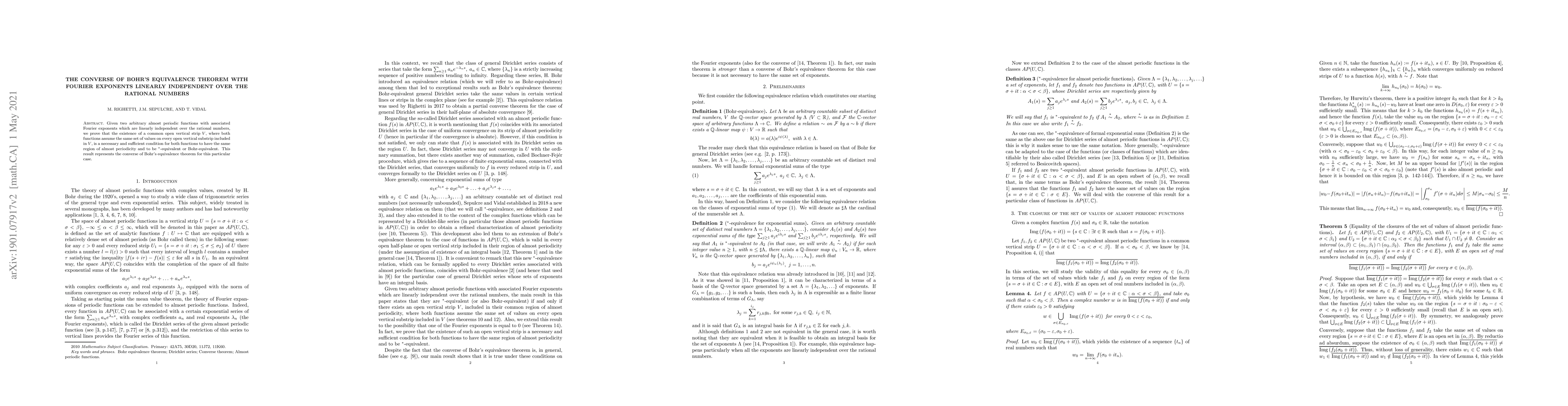 The paper proves a converse of Bohr's equivalence theorem for two almost periodic functions with linearly independent Fourier exponents, stating that shared values on open vertical substrips within a common interval is a necessary and sufficient condition for them to have the same region of almost periodicity and be equivalent.