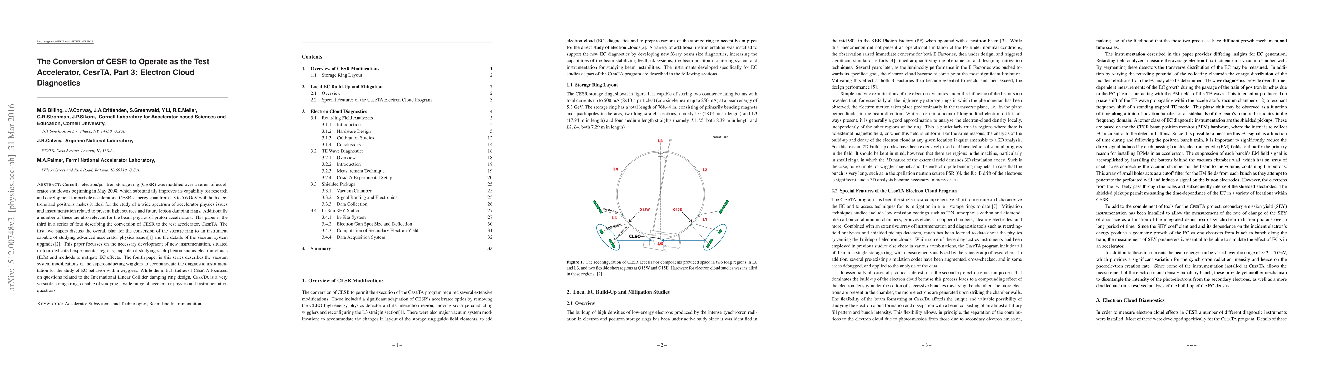 Cornell's electron/positron storage ring (CESR) was modified over a series of accelerator shutdowns beginning in May 2008, which substantially improves its capability for research and development for particle accelerators. CESR's energy span from 1.8 to 5.6 GeV with both electrons and positrons makes it ideal for the study of a wide spectrum of accelerator physics issues and instrumentation related to present light sources and future lepton damping rings. Additionally a number of these are also relevant for the beam physics of proton accelerators. This paper is the third in a series of four describing the the conversion of CESR to the test accelerator, CesrTA. The first two papers discuss the overall plan for the conversion of the storage ring to an instrument capable of studying advanced accelerator physics issues and the details of the vacuum system upgrades. This paper focusses on the necessary development of new instrumentation, situated in four dedicated experimental regions, capable of studying such phenomena as electron clouds (ECs) and methods to mitigate EC effects. The fourth paper in this series describes the vacuum system modifications of the superconducting wigglers to accommodate the diagnostic instrumentation for the study of EC behavior within wigglers. While the initial studies of CesrTA focussed on questions related to the International Linear Collider damping ring design, CesrTA is a very versatile storage ring, capable of studying a wide range of accelerator physics and instrumentation questions.