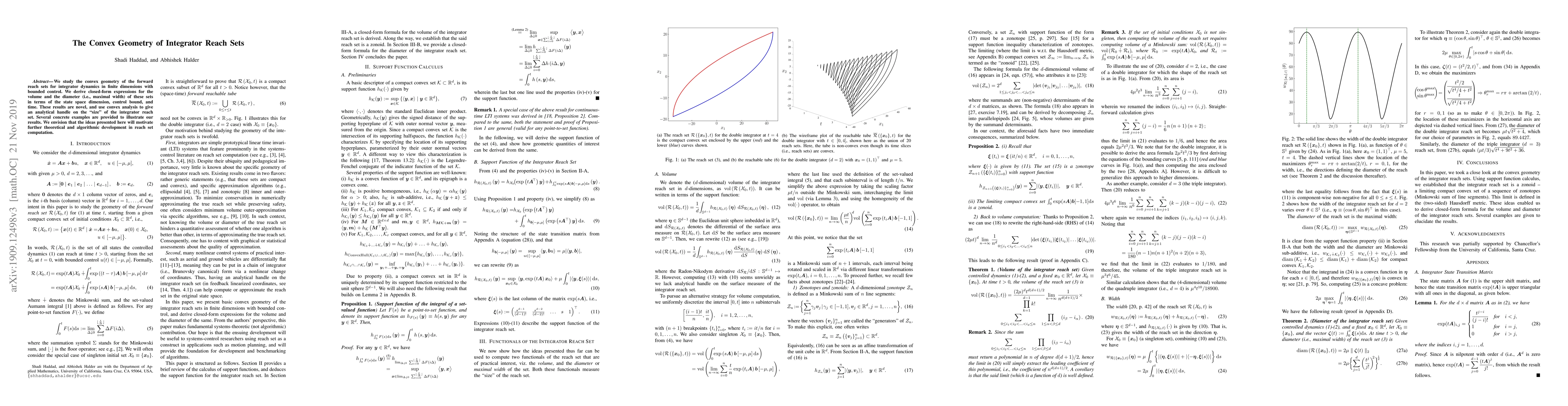 We study the convex geometry of the forward reach sets for integrator dynamics in finite dimensions with bounded control. We derive closed-form expressions for the volume and the diameter (i.e., maximal width) of these sets in terms of the state space dimension, control bound, and time. These results are novel, and use convex analysis to give an analytical handle on the "size" of the integrator reach set. Several concrete examples are provided to illustrate our results. We envision that the ideas presented here will motivate further theoretical and algorithmic development in reach set computation.