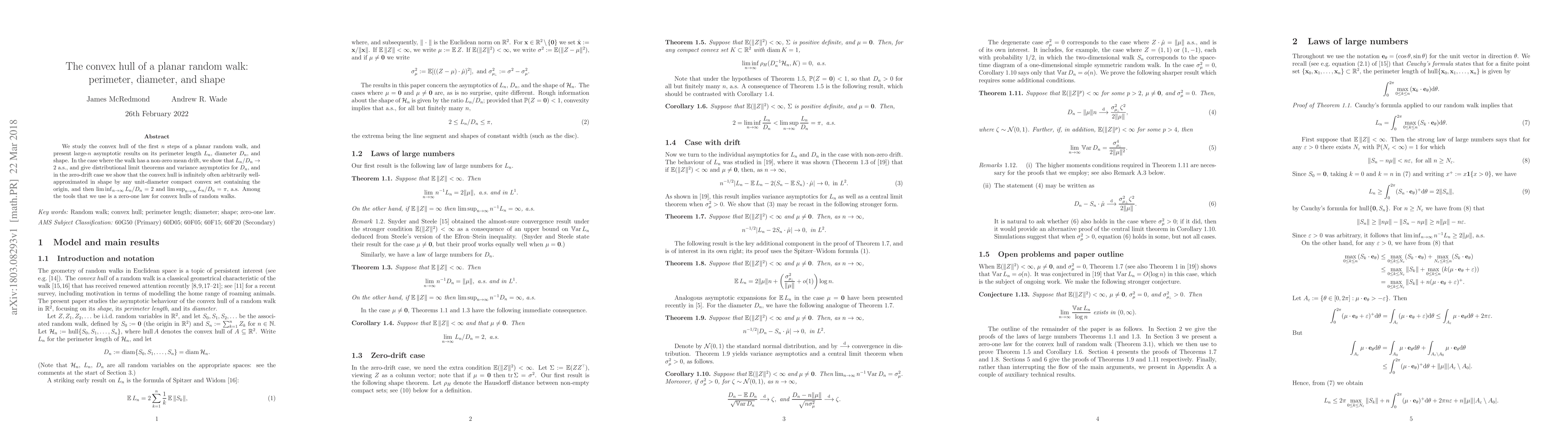 This paper investigates the asymptotic properties of the convex hull formed by the first $n$ steps of a planar random walk, showing that the perimeter-to-diameter ratio converges to 2 with non-zero mean drift and explores the shape approximation in the zero-drift scenario. It also introduces a zero-one law for convex hulls of random walks.