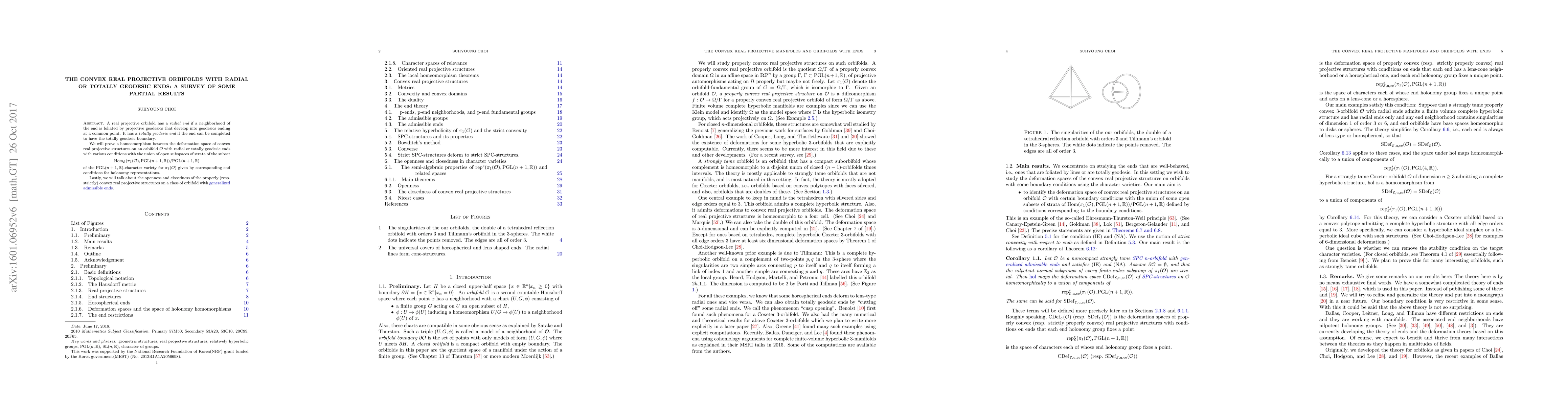 This paper surveys partial results regarding convex real projective orbifolds with radial or totally geodesic ends. It establishes a homeomorphism between the deformation space of such orbifolds and specific strata of the corresponding Hom space, discussing openness and closedness of certain convex structures.