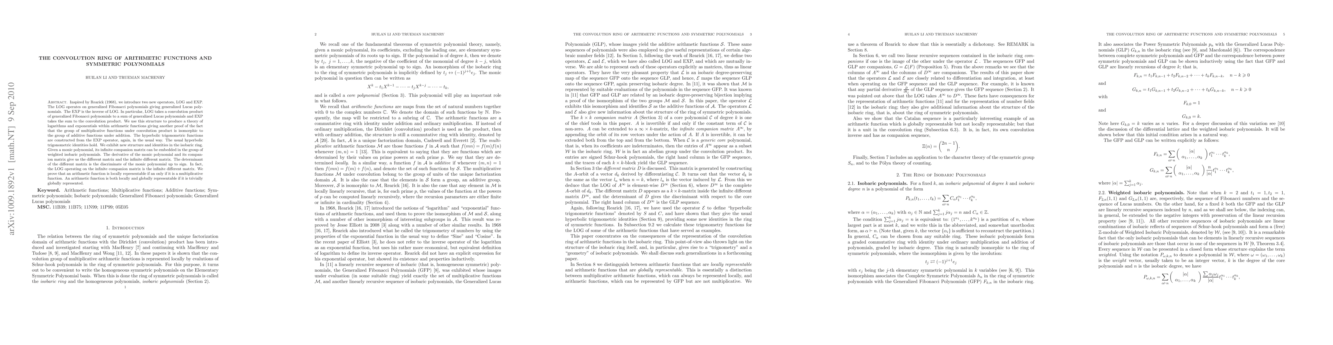 Inspired by Rearick (1968), we introduce two new operators, LOG and EXP. The LOG operates on generalized Fibonacci polynomials giving generalized Lucas polynomials. The EXP is the inverse of LOG. In particular, LOG takes a convolution product of generalized Fibonacci polynomials to a sum of generalized Lucas polynomials and EXP takes the sum to the convolution product. We use this structure to produce a theory of logarithms and exponentials within arithmetic functions giving another proof of the fact that the group of multiplicative functions under convolution product is isomorphic to the group of additive functions under addition. The hyperbolic trigonometric functions are constructed from the EXP operator, again, in the usual way. The usual hyperbolic trigonometric identities hold. We exhibit new structure and identities in the isobaric ring. Given a monic polynomial, its infinite companion matrix can be embedded in the group of weighted isobaric polynomials. The derivative of the monic polynomial and its companion matrix give us the different matrix and the infinite different matrix. The determinant of the different matrix is the discriminate of the monic polynomial up to sign. In fact, the LOG operating on the infinite companion matrix is the infinite different matrix. We prove that an arithmetic function is locally representable if an only if it is a multiplicative function. An arithmetic function is both locally and globally representable if it is trivially globally represented.