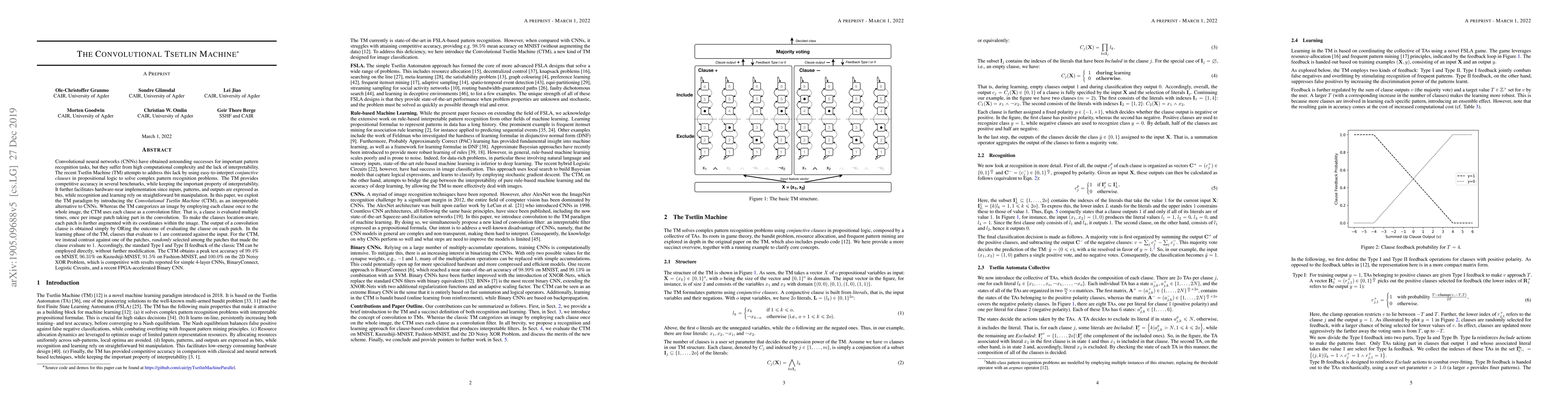 The Convolutional Tsetlin Machine (CTM) combines the interpretability of the Tsetlin Machine with convolutional filters to create an interpretable alternative to convolutional neural networks (CNNs). The CTM achieves competitive accuracy on various benchmarks while maintaining interpretability through bit manipulation.