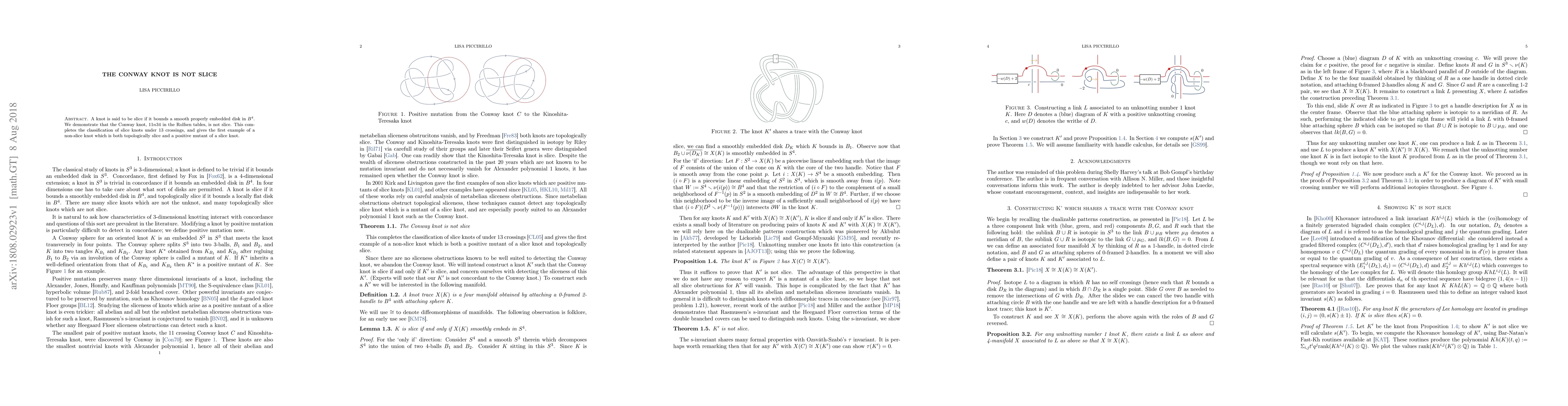 Researchers prove that the Conway knot is not a slice knot, completing the classification of slice knots under 13 crossings and providing a new example of a non-slice knot with topological slice properties.