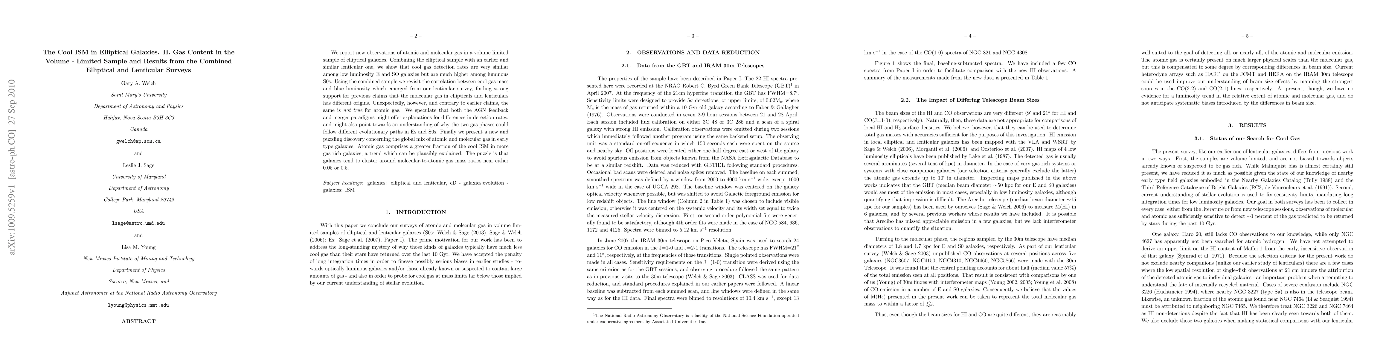 We report new observations of atomic and molecular gas in a volume limited sample of elliptical galaxies. Combining the elliptical sample with an earlier and similar lenticular one, we show that cool gas detection rates are very similar among low luminosity E and SO galaxies but are much higher among luminous S0s. Using the combined sample we revisit the correlation between cool gas mass and blue luminosity which emerged from our lenticular survey, finding strong support for previous claims that the molecular gas in ellipticals and lenticulars has different origins. Unexpectedly, however, and contrary to earlier claims, the same is not true for atomic gas. We speculate that both the AGN feedback and merger paradigms might offer explanations for differences in detection rates, and might also point towards an understanding of why the two gas phases could follow different evolutionary paths in Es and S0s. Finally we present a new and puzzling discovery concerning the global mix of atomic and molecular gas in early type galaxies. Atomic gas comprises a greater fraction of the cool ISM in more gas rich galaxies, a trend which can be plausibly explained. The puzzle is that galaxies tend to cluster around molecular-to-atomic gas mass ratios near either 0.05 or 0.5.