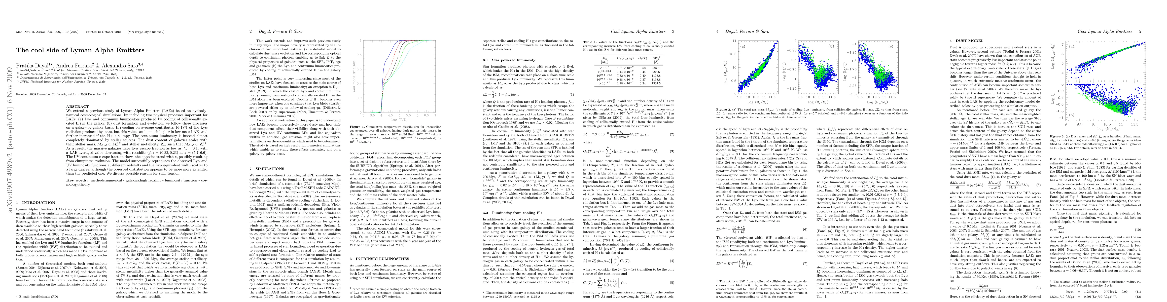 This study investigates Lyman Alpha Emitters (LAEs) using cosmological simulations, examining the contributions of HI cooling and dust formation to LAEs' luminosity. The research finds that HI cooling contributes significantly to Lyman Alpha radiation, especially in low-mass galaxies, while the continuum luminosity is mainly stellar. Dust content in galaxies correlates with stellar mass and metallicity, leading to a low Lyman Alpha escape fraction in massive galaxies. The model accurately reproduces observed luminosity functions but shows a tension in the Lyman Alpha equivalent width distribution.