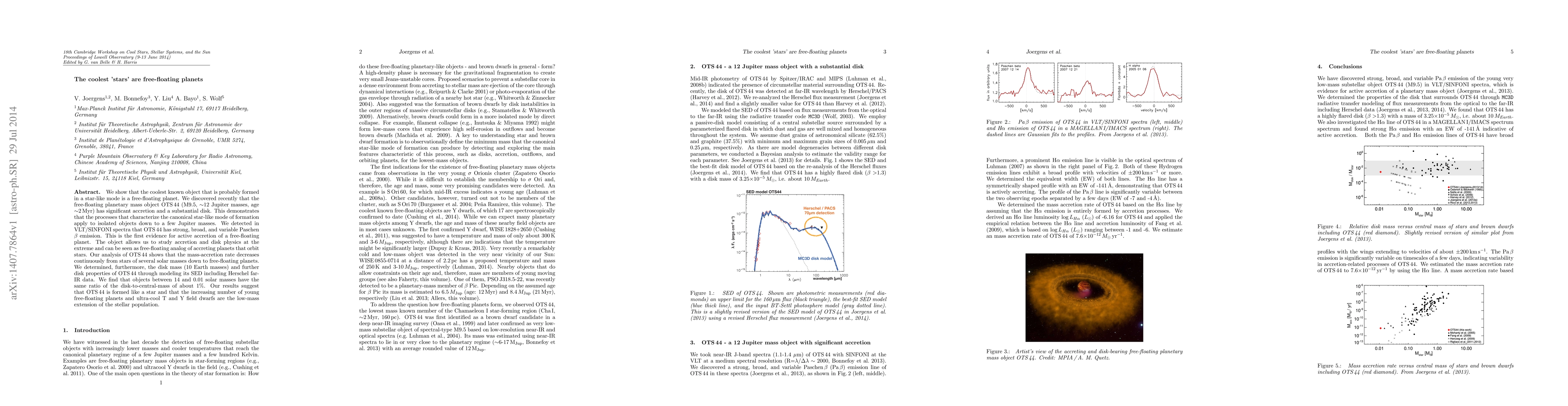 We show that the coolest known object that is probably formed in a star-like mode is a free-floating planet. We discovered recently that the free-floating planetary mass object OTS,44 (M9.5, ~12 Jupiter masses, age ~2 Myr) has significant accretion and a substantial disk. This demonstrates that the processes that characterize the canonical star-like mode of formation apply to isolated objects down to a few Jupiter masses. We detected in VLT/SINFONI spectra that OTS44 has strong, broad, and variable Paschen beta emission. This is the first evidence for active accretion of a free-floating planet. The object allows us to study accretion and disk physics at the extreme and can be seen as free-floating analog of accreting planets that orbit stars. Our analysis of OTS44 shows that the mass-accretion rate decreases continuously from stars of several solar masses down to free-floating planets. We determined, furthermore, the disk mass (10 Earth masses) and further disk properties of OTS44 through modeling its SED including Herschel far-IR data. We find that objects between 14 and 0.01 solar masses have the same ratio of the disk-to-central-mass of about 1%. Our results suggest that OTS44 is formed like a star and that the increasing number of young free-floating planets and ultra-cool T and Y field dwarfs are the low-mass extension of the stellar population.