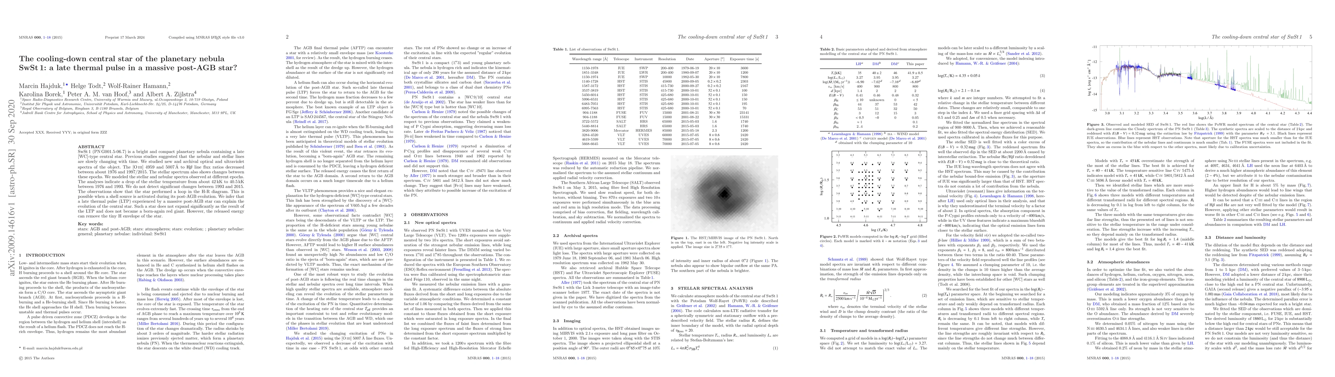 This paper investigates the evolution of the central star of the planetary nebula SwSt 1, finding evidence of a late thermal pulse in a massive post-AGB star that led to a temperature drop and a loop in the H-R diagram without significant expansion. The study suggests that the LTP removed the star's thin hydrogen envelope.