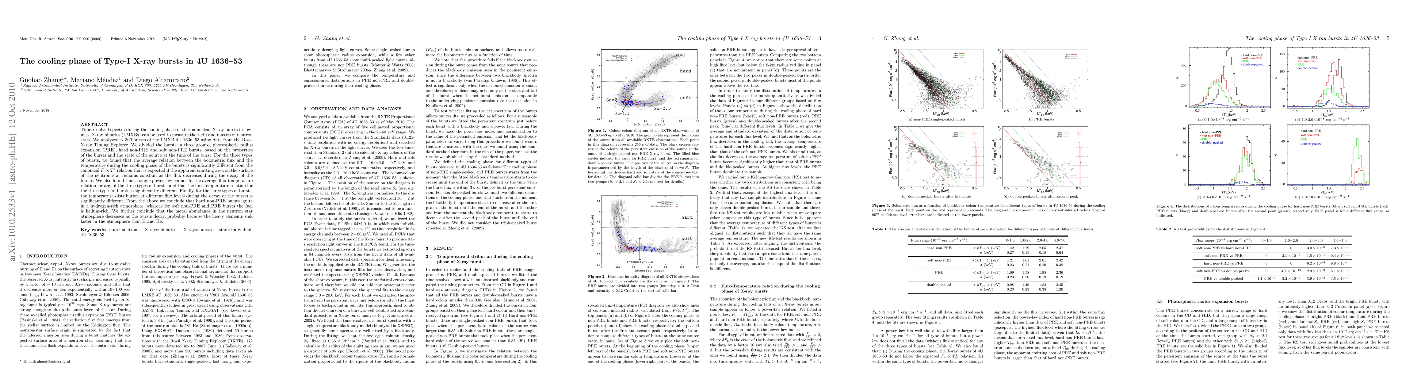 Time-resolved spectra during the cooling phase of thermonuclear X-ray bursts in low-mass X-ray binaries (LMXBs) can be used to measure the radii and masses of neutron stars. We analyzed ~ 300 bursts of the LMXB 4U 1636-53 using data from the Rossi X-ray Timing Explorer. We divided the bursts in three groups, photospheric radius expansion (PRE), hard non-PRE and soft non-PRE bursts, based on the properties of the bursts and the state of the source at the time of the burst. For the three types of bursts, we found that the average relation between the bolometric flux and the temperature during the cooling phase of the bursts is significantly different from the canonical $F \propto T^4$ relation that is expected if the apparent emitting area on the surface of the neutron star remains constant as the flux decreases during the decay of the bursts. We also found that a single power law cannot fit the average flux-temperature relation for any of the three types of bursts, and that the flux-temperature relation for the three types of bursts is significantly different. Finally, for the three types of bursts, the temperature distribution at different flux levels during the decay of the bursts is significantly different. From the above we conclude that hard non-PRE bursts ignite in a hydrogen-rich atmosphere, whereas for soft non-PRE and PRE bursts the fuel is helium-rich. We further conclude that the metal abundance in the neutron star atmosphere decreases as the bursts decay, probably because the heavy elements sink faster in the atmosphere than H and He.