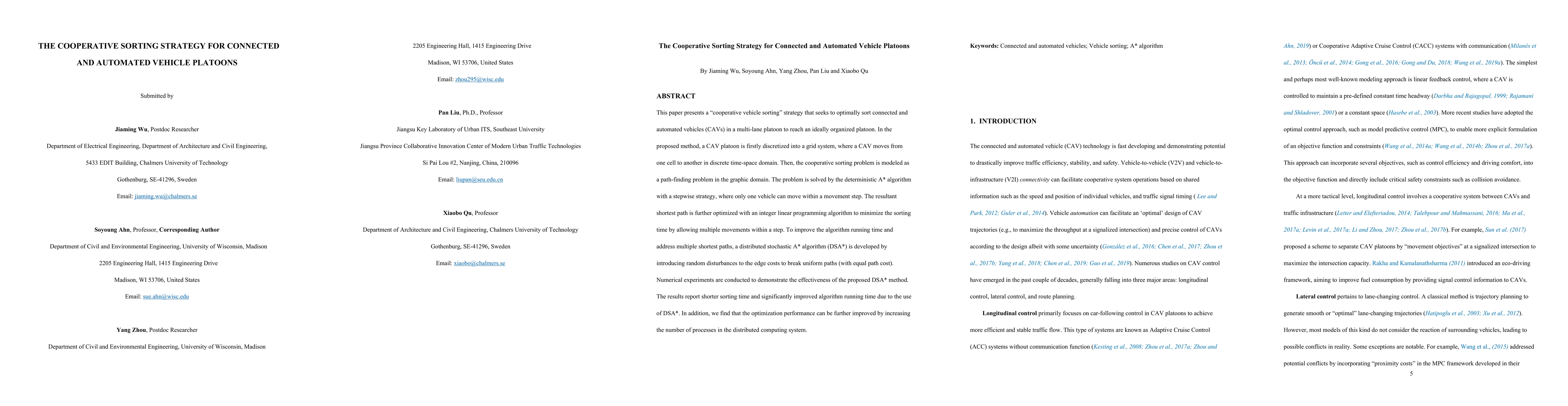 A new algorithm called Distributed Stochastic AStar (DSA) is proposed to efficiently sort connected and automated vehicles in a platoon, reducing sorting time and improving running time.