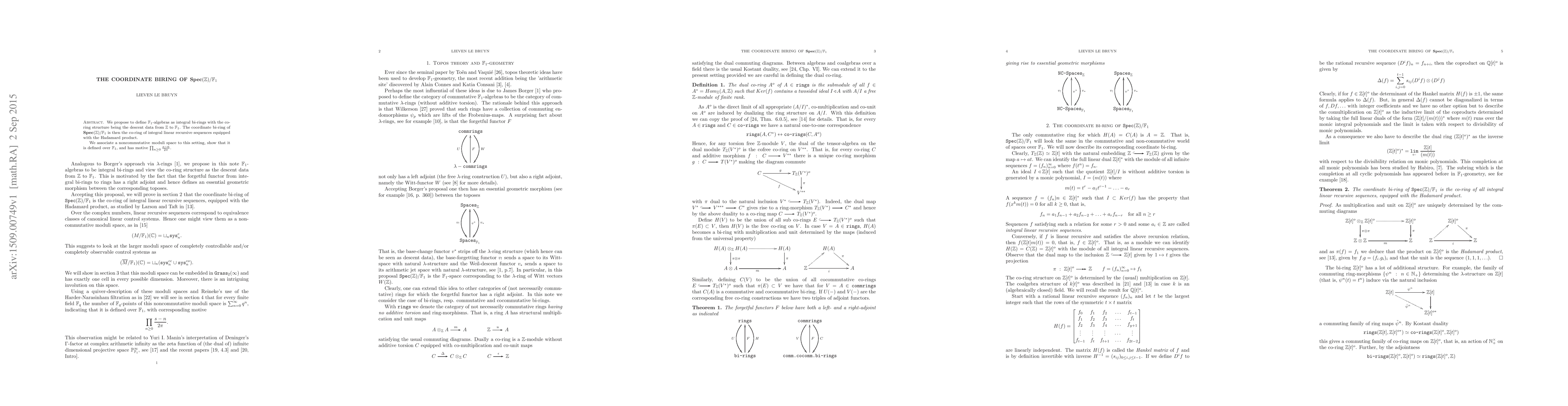 We propose to define $\mathbb{F}_1$-algebras as integral bi-rings with the co-ring structure being the descent data from $\mathbb{Z}$ to $\mathbb{F}_1$. The coordinate bi-ring of $\mathbf{Spec}(\mathbb{Z})/\mathbb{F}_1$ is then the co-ring of integral linear recursive sequences equipped with the Hadamard product. We associate a noncommutative moduli space to this setting, show that it is defined over $\mathbb{F}_1$, and has motive $\prod_{n \geq 0} \frac{s-n}{2 \pi}$.