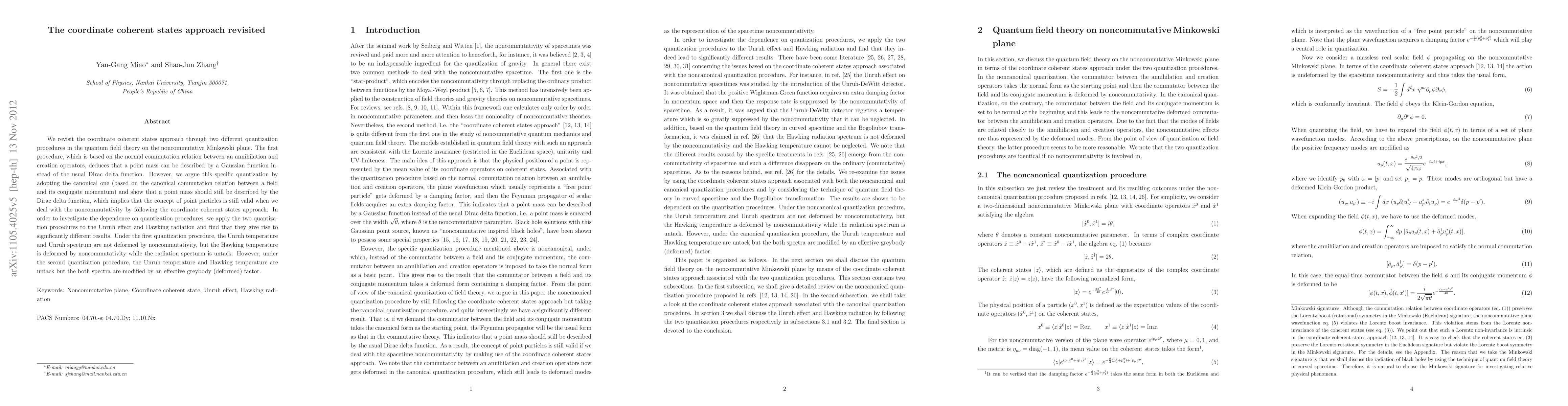 This paper revisits the coordinate coherent states approach in quantum field theory on the noncommutative Minkowski plane, comparing two quantization procedures. It finds that while one procedure suggests a Gaussian function for point masses, the canonical approach maintains the Dirac delta function, affirming the validity of point particles. The study also reveals differing outcomes for the Unruh effect and Hawking radiation under the two quantization methods.