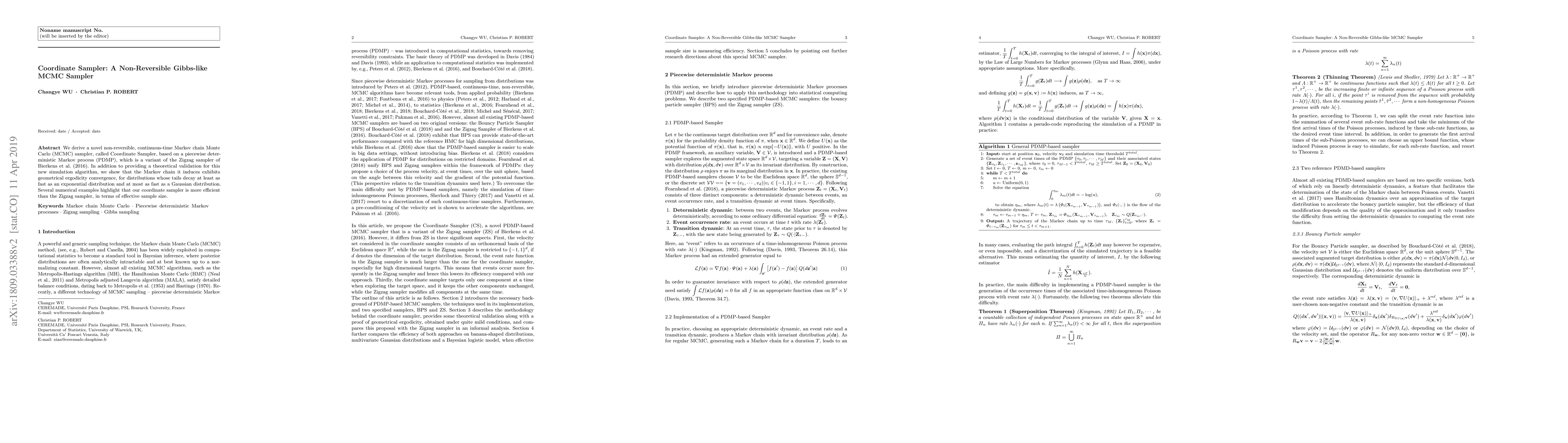 Researchers developed a new efficient Markov chain Monte Carlo sampler called Coordinate Sampler, which outperforms existing methods like Zigzag for certain distributions.