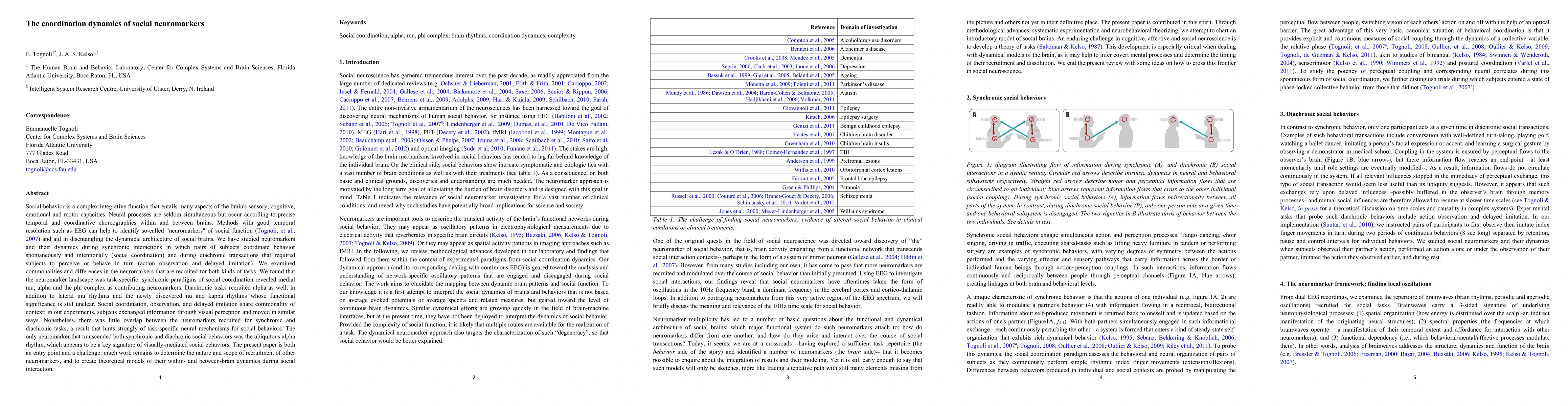 Social behavior is a complex integrative function that entails many aspects of the brain's sensory, cognitive, emotional and motor capacities. Neural processes are seldom simultaneous but occur according to precise temporal and coordinative choreographies within and between brains. Methods with good temporal resolution such as EEG can help to identify so-called "neuromarkers" of social function (Tognoli, et al., 2007) and aid in disentangling the dynamical architecture of social brains. We have studied neuromarkers and their dynamics during synchronic interactions in which pairs of subjects coordinate behavior spontaneously and intentionally (social coordination) and during diachronic transactions that required subjects to perceive or behave in turn (action observation and delayed imitation). We examined commonalities and differences in the neuromarkers that are recruited for both kinds of tasks. We found that the neuromarker landscape was task-specific: synchronic paradigms of social coordination revealed medial mu, alpha and the phi complex as contributing neuromarkers. Diachronic tasks recruited alpha as well, in addition to lateral mu rhythms and the newly discovered nu and kappa rhythms whose functional significance is still unclear. Social coordination, observation, and delayed imitation share commonality of context: in our experiments, subjects exchanged information through visual perception and moved in similar ways. Nonetheless, there was little overlap between the neuromarkers recruited for synchronic and diachronic tasks, a result that hints strongly of task-specific neural mechanisms for social behaviors. The only neuromarker that transcended both synchronic and diachronic social behaviors was the ubiquitous alpha rhythm, which appears to be a key signature of visually-mediated social behaviors. The present paper is both an entry point and a challenge...