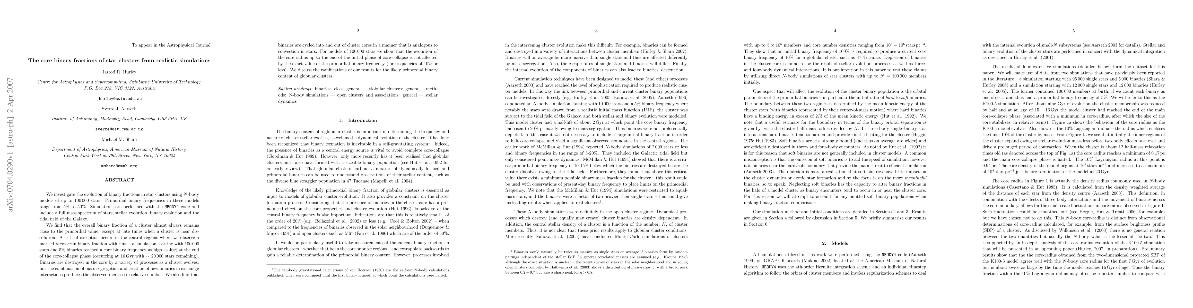 We investigate the evolution of binary fractions in star clusters using N-body models of up to 100000 stars. Primordial binary frequencies in these models range from 5% to 50%. Simulations are performed with the NBODY4 code and include a full mass spectrum of stars, stellar evolution, binary evolution and the tidal field of the Galaxy. We find that the overall binary fraction of a cluster almost always remains close to the primordial value, except at late times when a cluster is near dissolution. A critical exception occurs in the central regions where we observe a marked increase in binary fraction with time -- a simulation starting with 100000 stars and 5% binaries reached a core binary frequency as high as 40% at the end of the core-collapse phase (occurring at 16 Gyr with ~20000 stars remaining). Binaries are destroyed in the core by a variety of processes as a cluster evolves, but the combination of mass-segregation and creation of new binaries in exchange interactions produces the observed increase in relative number. We also find that binaries are cycled into and out of cluster cores in a manner that is analogous to convection in stars. For models of 100000 stars we show that the evolution of the core-radius up to the end of the initial phase of core-collapse is not affected by the exact value of the primordial binary frequency (for frequencies of 10% or less). We discuss the ramifications of our results for the likely primordial binary content of globular clusters.