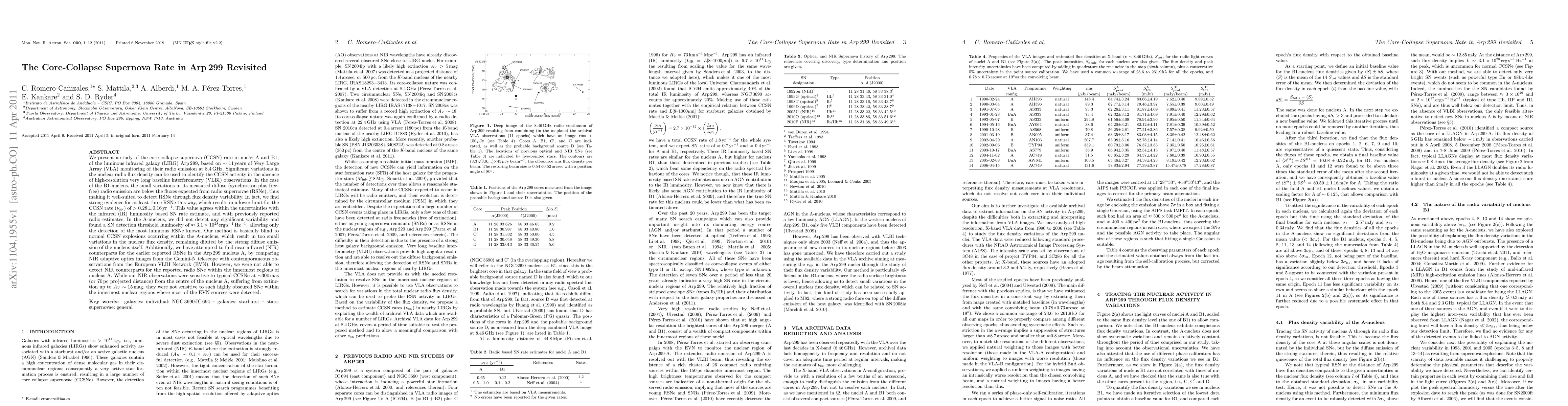 We present a study of the CCSN rate in nuclei A and B1 of the luminous infrared galaxy Arp299, based on 11 years of Very Large Array monitoring of their radio emission at 8.4 GHz. Significant variations in the nuclear radio flux density can be used to identify the CCSN activity in the absence of high-resolution very long baseline interferometry observations. In the case of the B1-nucleus, the small variations in its measured diffuse radio emission are below the fluxes expected from radio supernovae, thus making it well-suited to detect RSNe through flux density variability. In fact, we find strong evidence for at least three RSNe this way, which results in a lower limit for the CCSN rate of 0.28 +/- 0.16 per year. In the A-nucleus, we did not detect any significant variability and found a SN detection threshold luminosity which allows only the detection of the most luminous RSNe known. Our method is basically blind to normal CCSN explosions occurring within the A-nucleus, which result in too small variations in the nuclear flux density, remaining diluted by the strong diffuse emission of the nucleus itself. Additionally, we have attempted to find near-infrared counterparts for the earlier reported RSNe in the Arp299 nucleus A, by comparing NIR adaptive optics images from the Gemini-N telescope with contemporaneous observations from the European VLBI Network. However, we were not able to detect NIR counterparts for the reported radio SNe within the innermost regions of nucleus A. While our NIR observations were sensitive to typical CCSNe at 300 mas from the centre of the nucleus A, suffering from extinction up to A_v~15 mag, they were not sensitive to such highly obscured SNe within the innermost nuclear regions where most of the EVN sources were detected. (abridged)