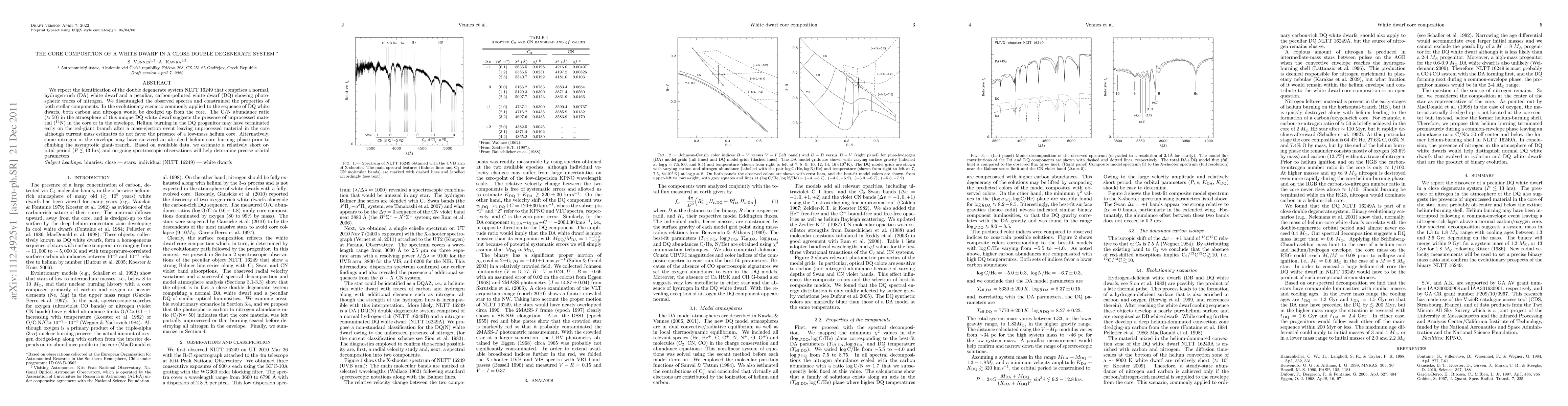 This paper identifies the double degenerate system NLTT 16249, consisting of a DA white dwarf and a DQ white dwarf with nitrogen traces, and explores the core composition implications. The high C/N ratio suggests unprocessed material in the core, indicating either early termination of helium burning or survival of nitrogen from an abridged helium-core burning phase.
