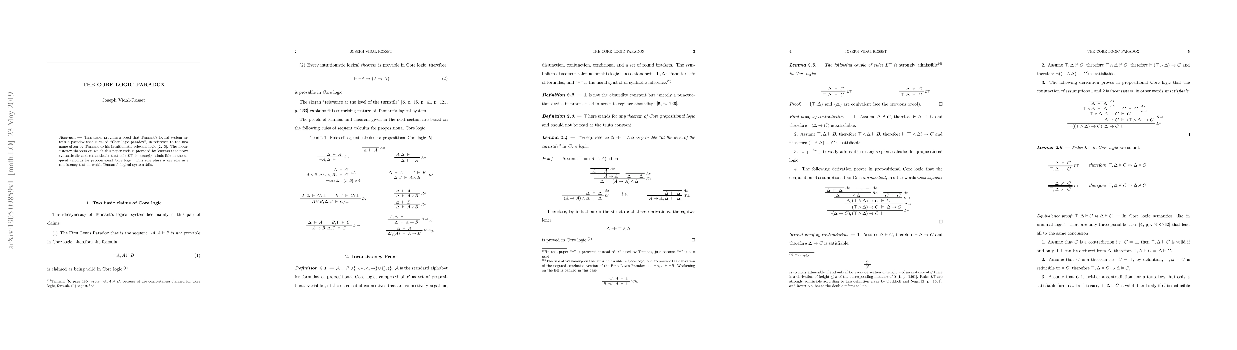 This paper demonstrates a paradox in Tennant's logical system, now termed the Core logic paradox, challenging his intuitionistic relevant logic. The proof reveals inherent contradictions within the system.