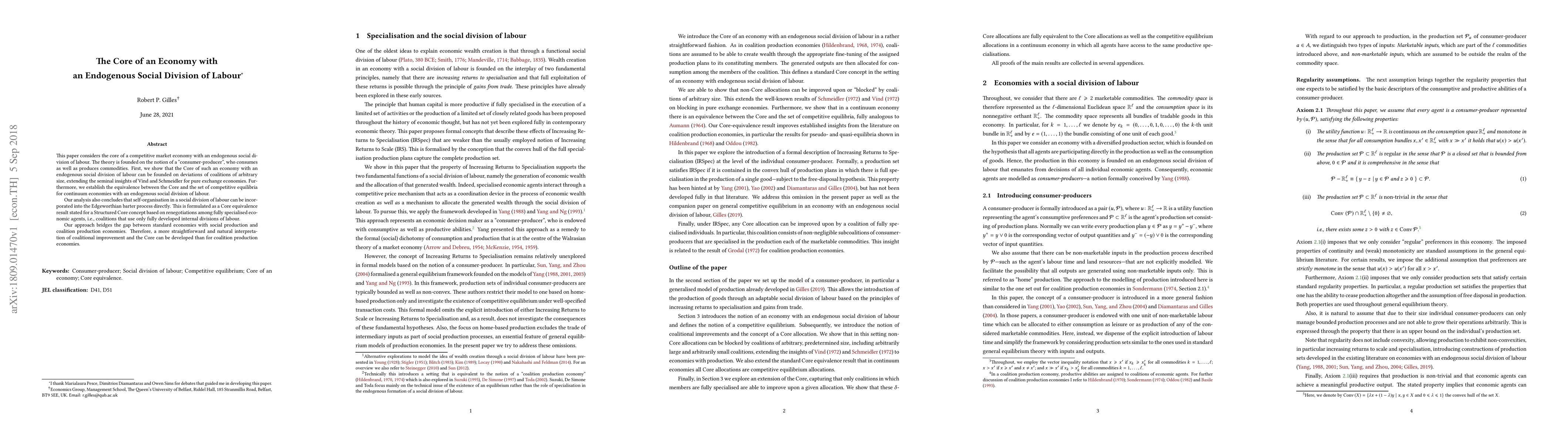 This paper explores the core of a competitive market economy with an endogenous social division of labour, demonstrating the equivalence between the Core and competitive equilibria, and showing how self-organisation in labour division can be integrated into the Edgeworthian barter process. It bridges standard and coalition production economies, offering a more intuitive interpretation of coalitional improvement.