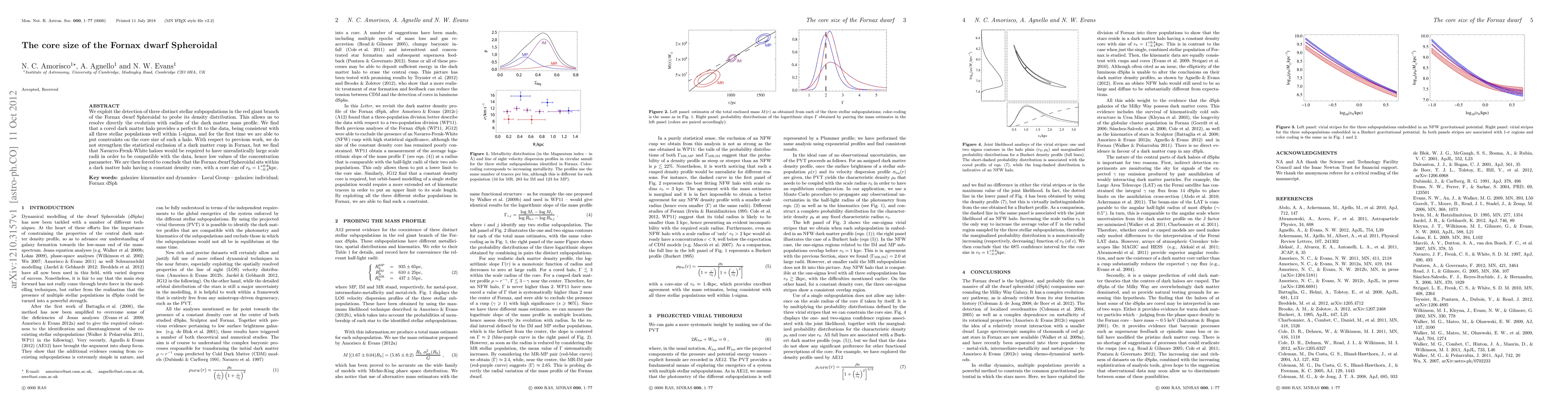 This paper investigates the dark matter halo of the Fornax dwarf Spheroidal using three stellar subpopulations, finding a cored dark matter halo fits the data well. The study concludes that the core size of this halo is between 0.6 and 1.8 kpc, ruling out large-scale Navarro-Frenk-White halos.