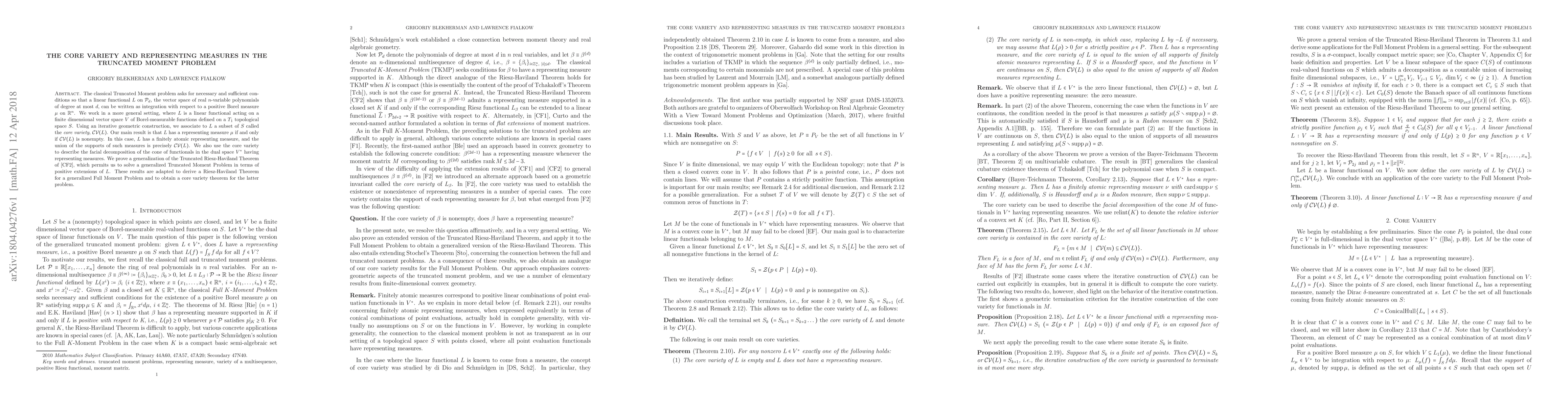 The classical Truncated Moment problem asks for necessary and sufficient conditions so that a linear functional $L$ on $\mathcal{P}_{d}$, the vector space of real $n$-variable polynomials of degree at most $d$, can be written as integration with respect to a positive Borel measure $\mu$ on $\mathbb{R}^n$. We work in a more general setting, where $L$ is a linear functional acting on a finite dimensional vector space $V$ of Borel-measurable functions defined on a $T_{1}$ topological space $S$. Using an iterative geometric construction, we associate to $L$ a subset of $S$ called the \textit{core variety}, $\mathcal{CV}(L)$. Our main result is that $L$ has a representing measure $\mu$ if and only if $\mathcal{CV}(L)$ is nonempty. In this case, $L$ has a finitely atomic representing measure, and the union of the supports of such measures is precisely $\mathcal{CV}(L)$. We also use the core variety to describe the facial decomposition of the cone of functionals in the dual space $V^{*}$ having representing measures. We prove a generalization of the Truncated Riesz-Haviland Theorem of Curto-Fialkow, which permits us to solve a generalized Truncated Moment Problem in terms of positive extensions of $L$. These results are adapted to derive a Riesz-Haviland Theorem for a generalized Full Moment Problem and to obtain a core variety theorem for the latter problem.