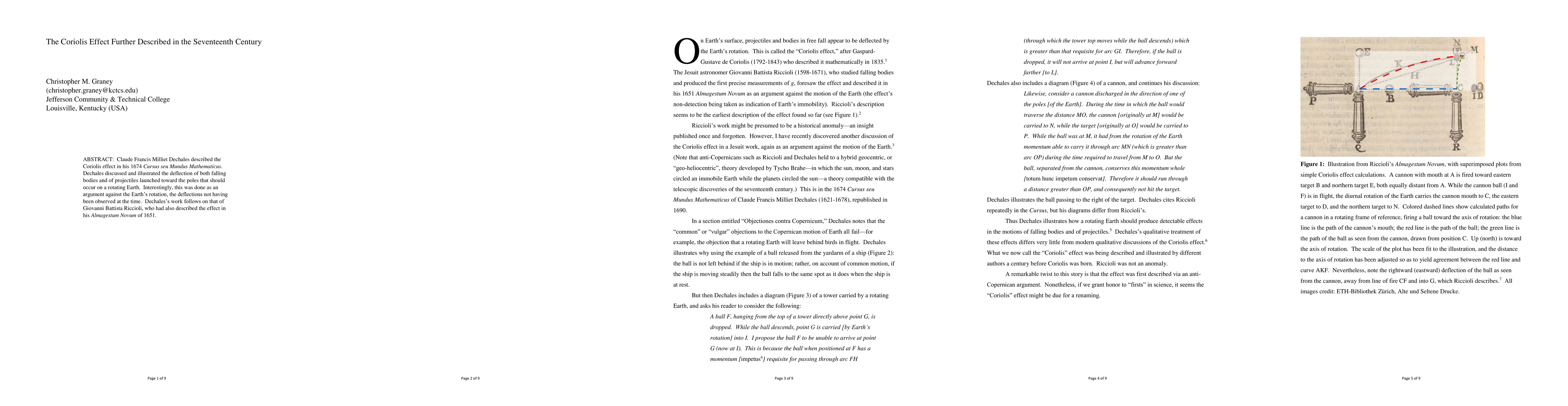 Summary: In his 1674 work, Cursus seu Mundus Mathematicus, Claude Francis Milliet Dechales described the Coriolis effect, arguing against Earth's rotation by illustrating the theoretical deflection of falling bodies and projectiles on a rotating Earth, following Giovanni Battista Riccioli's earlier description in 1651's Almagestum Novum.