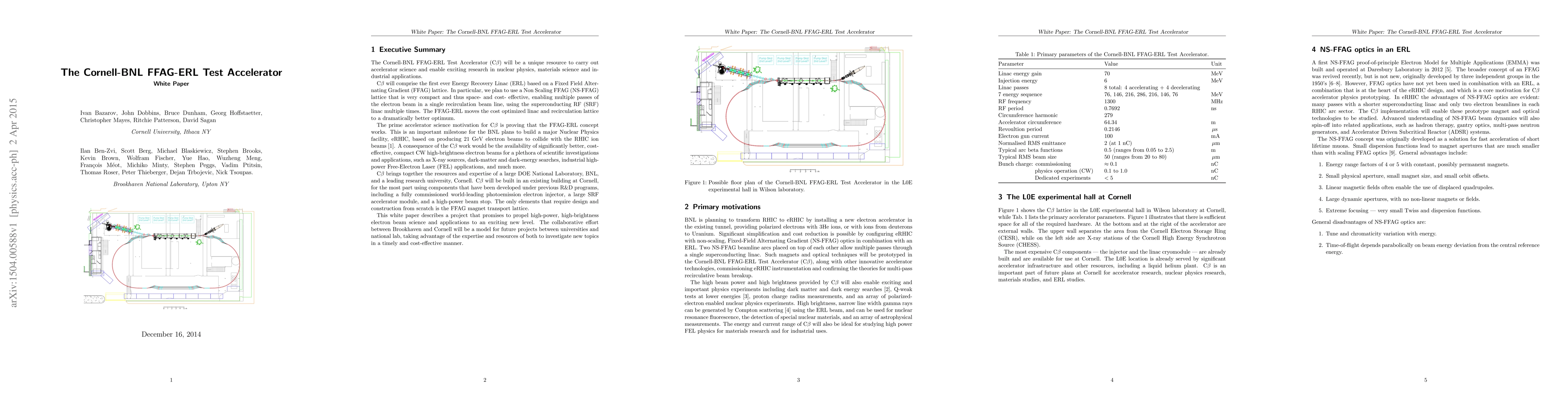 The Cornell-BNL FFAG-ERL Test Accelerator aims to demonstrate the feasibility of a compact, cost-effective Energy Recovery Linac (ERL) based on a Fixed Field Alternating Gradient (FFAG) lattice, crucial for Brookhaven National Laboratory's eRHIC project and various scientific applications. The project leverages existing components and expertise to achieve a groundbreaking advancement in high-brightness electron beam technology.