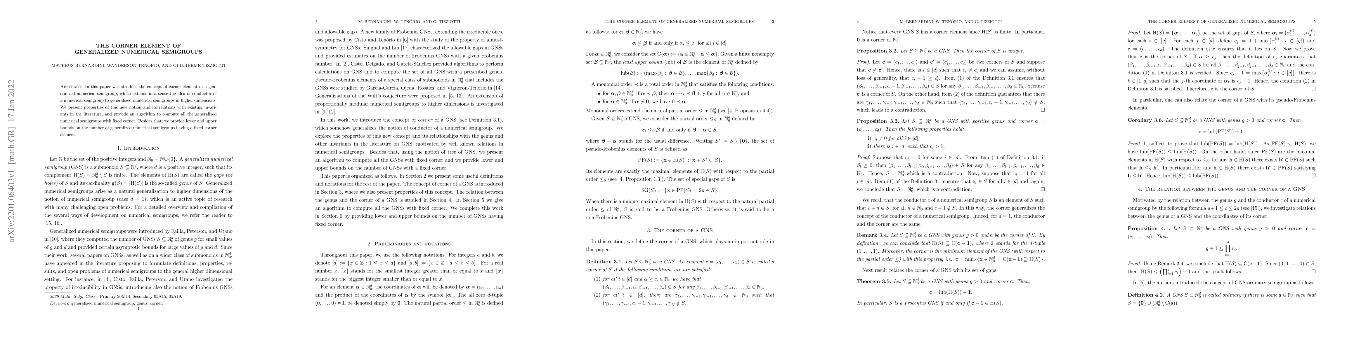 This paper introduces the concept of the corner element in generalized numerical semigroups, extending the notion of conductor, and provides properties, relations to existing invariants, and an algorithm for computing such semigroups. It also establishes bounds on the number of these semigroups with a fixed corner element.
