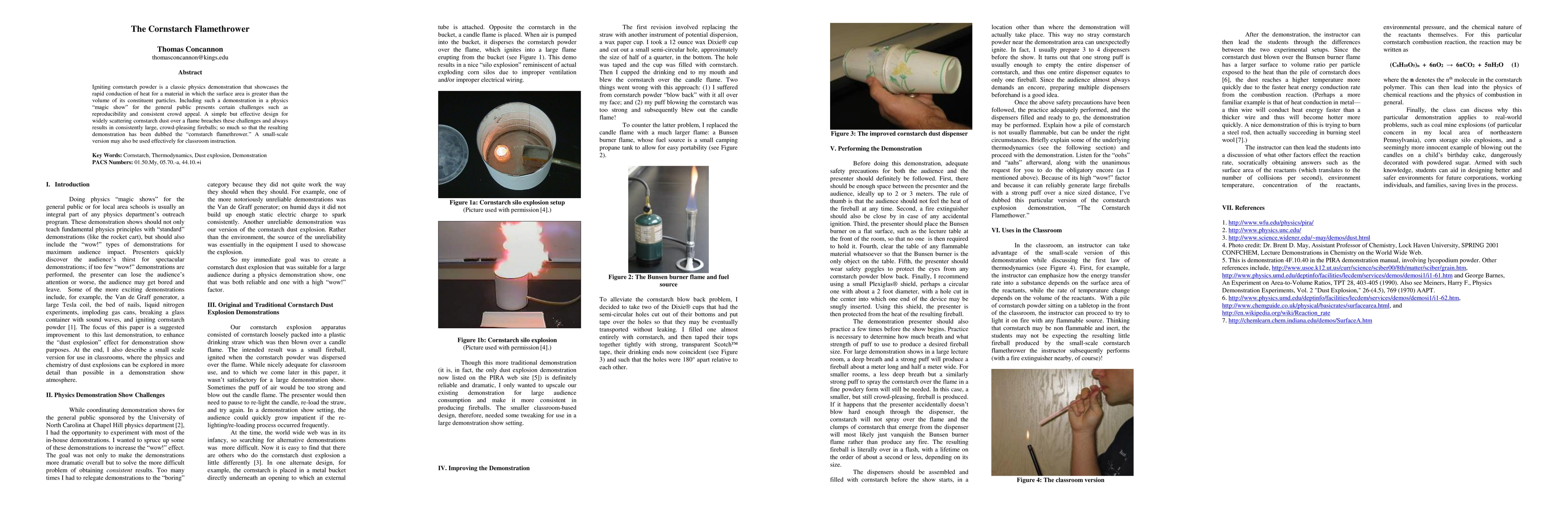Igniting cornstarch powder is a classic physics demonstration that showcases the rapid conduction of heat for a material in which the surface area is greater than the volume of its constituent particles. Including such a demonstration in a physics "magic show" for the general public presents certain challenges such as reproducibility and consistent crowd appeal. A simple but effective design for widely scattering cornstarch dust over a flame breaches these challenges and always results in consistently large, crowd-pleasing fireballs; so much so that the resulting demonstration has been dubbed the "cornstarch flamethrower." A small-scale version may also be used effectively for classroom instruction.