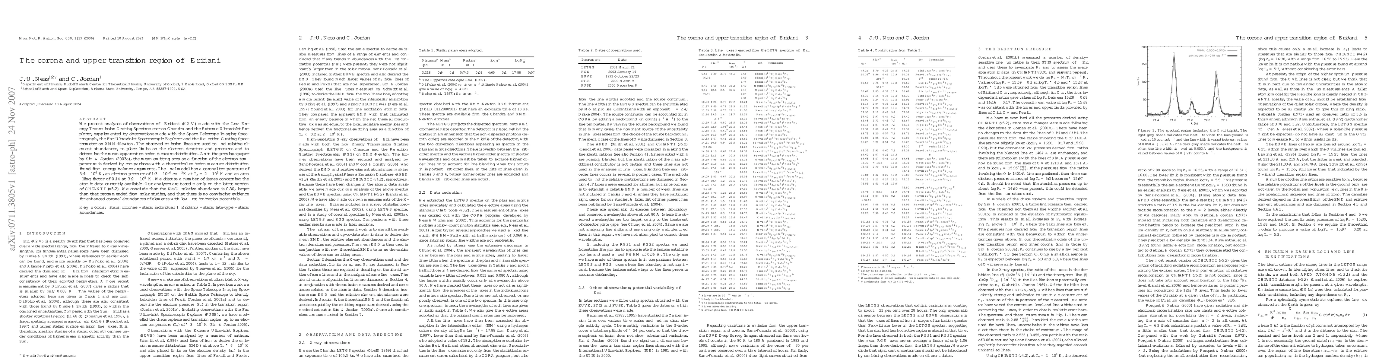 This paper analyzes epsilon Eridani's corona and upper transition region using data from multiple space telescopes, determining element abundances, electron densities, and emission measures. The derived model shows a coronal temperature of 3.4 x 10^6 K, with a Ne/O abundance ratio of 0.30, higher than solar values, and no evidence for enhanced abundances of low first ionization potential elements.