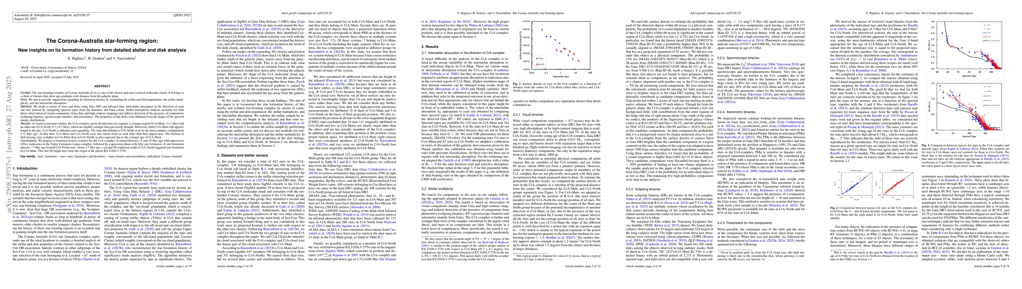 The star-forming complex of Corona Australis (CrA) is one of the closest and most isolated molecular clouds. It belongs to a chain of clusters that show age gradients with distance from the galactic plane. We aim to provide suggestions regarding its formation history by examining the stellar and disk populations, stellar multiplicity, and interstellar absorption. We made a census of stars and disks using Gaia DR3 and infrared data. Interstellar absorption in the direction of each star was derived by comparing SpTy from the literature and Gaia colors. Stellar multiplicity analysis accounts for both direct observation of visual companions (Gaia data and high-contrast imaging) and indirect detection of the presence of companions (eclipsing and spectroscopic binaries, and astrometry). The properties of the disks were obtained from the slopes of the spectral energy distributions. As found in previous studies, the CrA complex can be divided into two regions: a younger region (CrA-Main: 3+/-1Myr) and an older one (CrA-North: 6.7+/-0.3Myr), slightly younger than previously thought. While CrA-Main still appears bound to the gas, CrA-North is unbound and expanding. The stars that belong to CrA-North were in the most compact configuration 3.72Myr ago. At that time, CrA-Main and CrA-North were much closer to each other than they appear now. The fraction of disk-bearing stars is higher in Main than in North, as also expected due to the younger age of CrA-Main. We propose a formation history scenario for the CrA-complex. It started between 15 and 18 Myr ago with SNe explosions in the Upper Centaurus-Lupus complex, followed by a quiescent phase with little star formation. A star formation episode about 7Myr ago formed CrA-North stars. About 3.7Myr ago, a second SN explosion south of CrA-North triggered star formation in CrA-Main. This last SN might have been the origin of the pulsar RX J1856.5-3754.